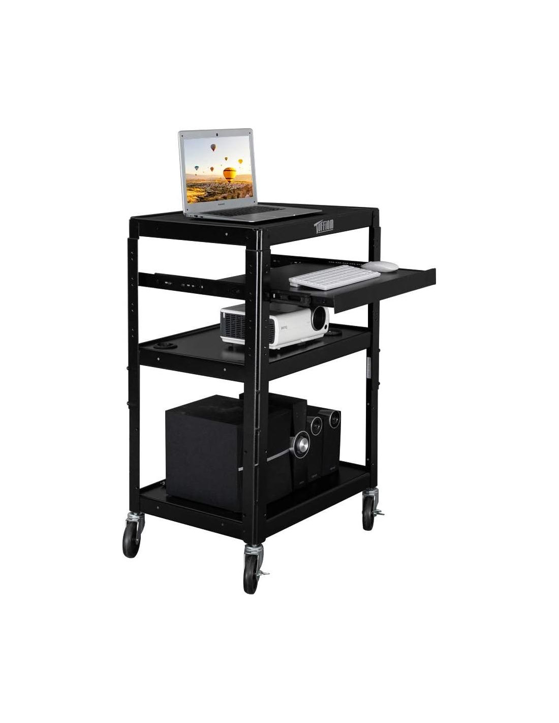 - RUEDAS RODANTES Las grandes ruedas giratorias (10 cm de diámetro) facilitan el traslado de un aula a otra. El profesor puede colocar todas las necesidades en este carro de presentación, como computadora portátil, ratón, proyector y altavoz. Dos de las cuatro ruedas son bloqueables.
