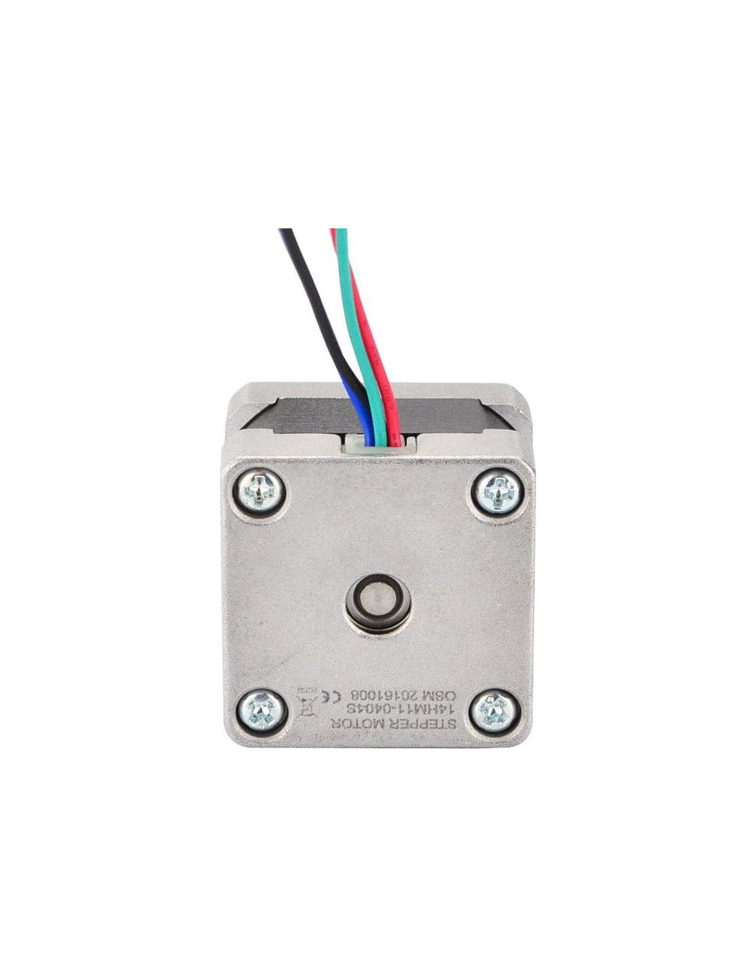 Este motor paso a paso bipolar híbrido Nema 14 con un ángulo de paso de 0.9 grados (400 pasos/revolución). Cada fase consume 400 mA a 10 V, lo que permite un par de retención de 11Ncm(15.6oz.in). Especificación eléctrica: * Número de parte del fabricante: 14HM11-0404S * Tipo de motor: Bipolar Paso a Paso * Ángulo de paso: 0.9 grados * Par de retención: 11Ncm(15.6oz.in) * Corriente nominal/fase: 0.4A * Resistencia de fase: 2.5ohms * Inductancia: 24mH+/-20%(1KHz) Especificación física: * Tamaño del marco: 35 x 35mm * Longitud del cuerpo: 28mm * Diámetro del eje: 5mm * Longitud del eje: 24mm * Longitud D-corte: 15mm * Número de cables: 4 * Longitud del cable: 300mm * Peso: 140g Conexión: Negro(A+), Verde(A-), Rojo(B+), Azul(B-) Advertencia: Asegúrese de que el motor esté conectado a un controlador de corriente constante o de conmutación antes de probar el motor. Conectar el motor directamente a una fuente de alimentación destruirá el motor.
