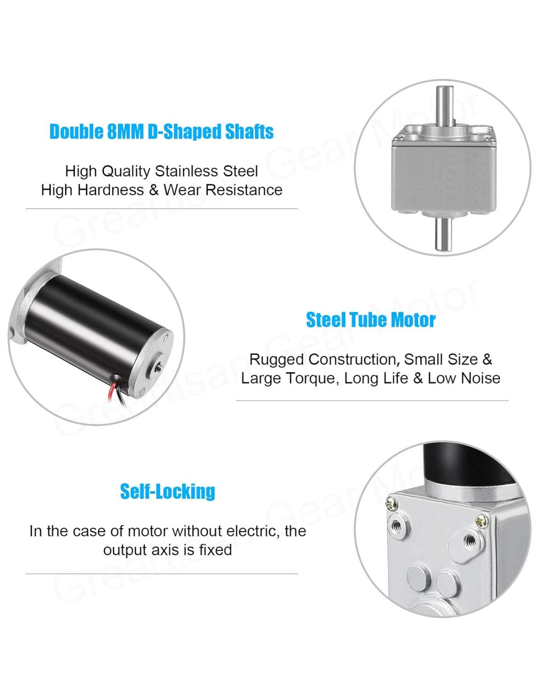 - Alta Torque & Menor Ruido: Larga vida del cepillo de carbono, diseño de engranaje de alta precisión, tamaño pequeño, alto torque, bajo ruido, alta eficiencia.
