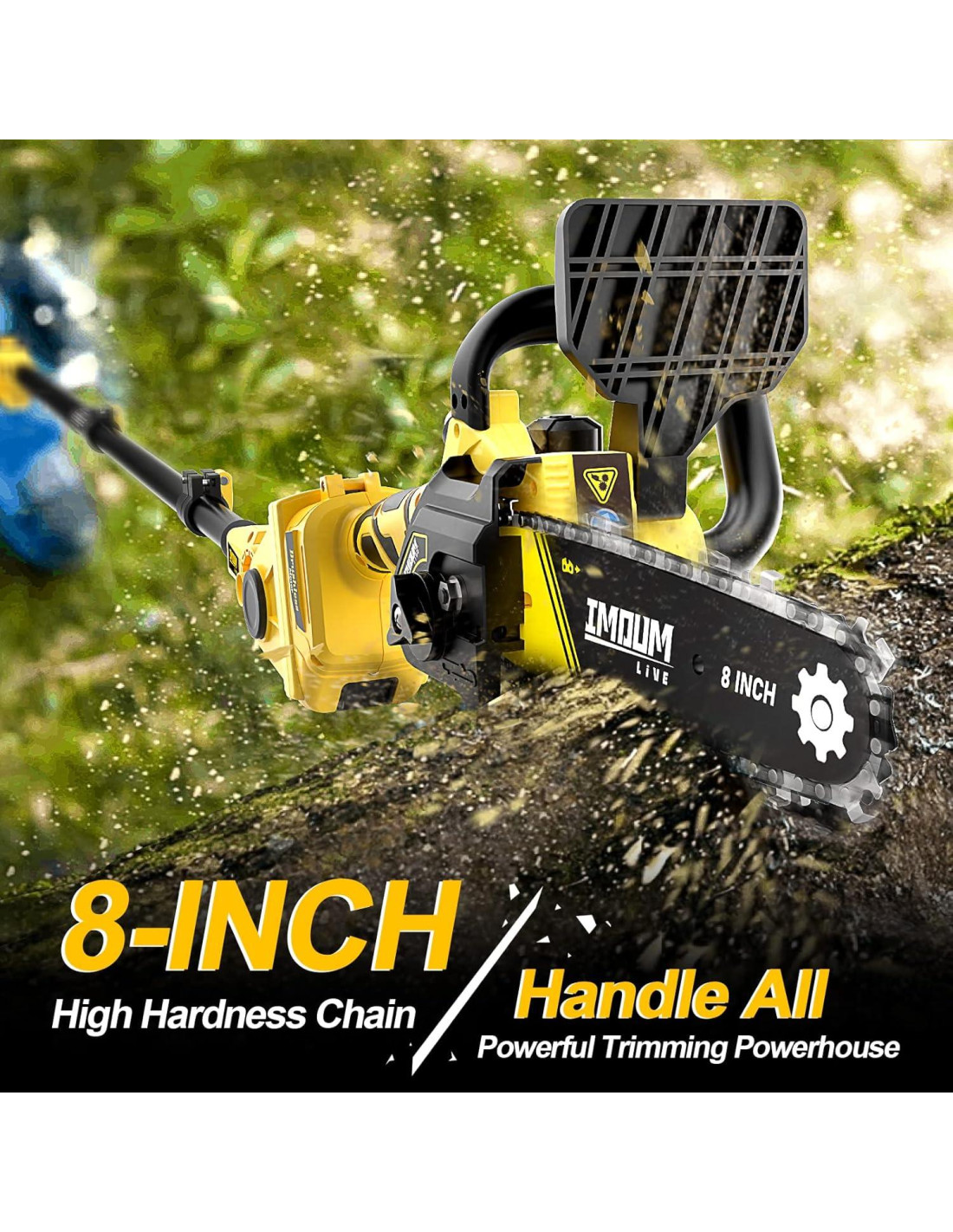 - Actualización de la Combinación de Sierra de Poste Inalámbrica Rotatable y Motosierra de 8 Pulgadas: IMOUMLIVE ha realizado una nueva actualización a la motosierra sin escobillas de 8 pulgadas con una barra de extensión de corte rotativa y multiángulo adicional (que se puede instalar y usar a voluntad según la situación real). Puedes usar la motosierra sola para recortar ramas bajas, o instalar el poste de extensión para manejar trabajos en altura. Una herramienta tiene dos usos para satisfacer las necesidades de los usuarios en diferentes escenarios de trabajo.