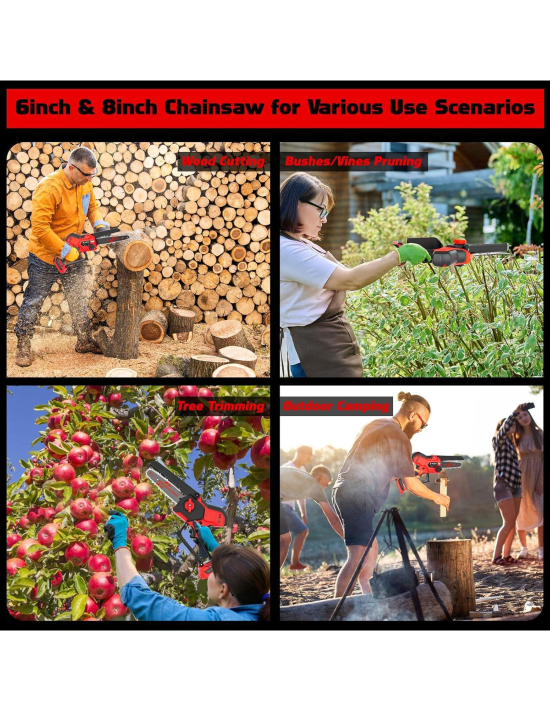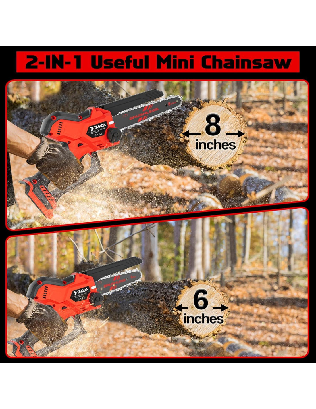 - Útil motosierra mini 2-en-1: La motosierra inalámbrica TAIRDA proporciona barras de tamaños de 8 pulgadas y 6 pulgadas, el diseño único 2-en-1 satisface varios proyectos de corte, como cortar diámetros de 2.54 cm a 20.32 cm (1 pulgada a 8 pulgadas), cortando piezas, rebanadas o trozos sin problema. Ampliamente utilizada en su jardín, huertos, rancho, chimenea, camping para poda de árboles, poda de ramas, corte de madera, etc.