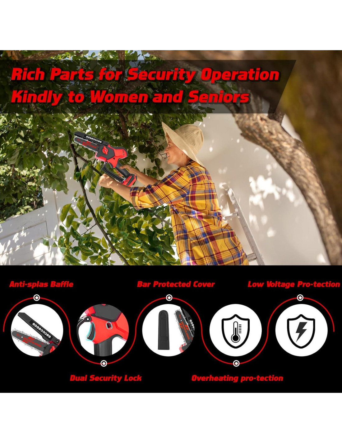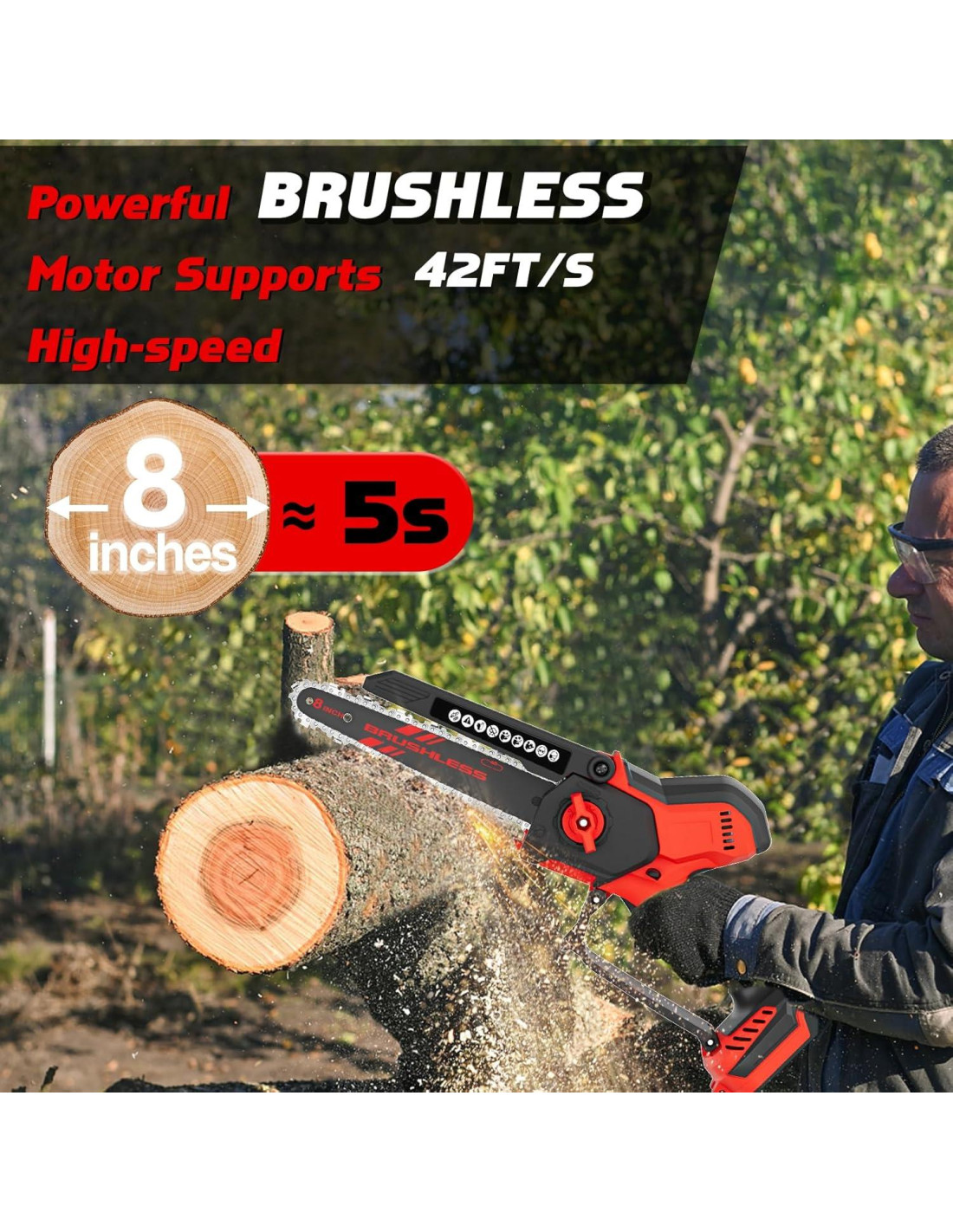 - Corte potente y excelente: Nuestra mini motosierra está bien construida con un motor sin escobillas de 800 vatios de superpotencia, soporta altas velocidades de corte de hasta 12.8 m/s (42FT/S), corta ramas de hasta 20.32 cm (8 pulgadas) en segundos, sin esfuerzo. Reduce mucho su tiempo de poda y ahorra su energía y dinero.
