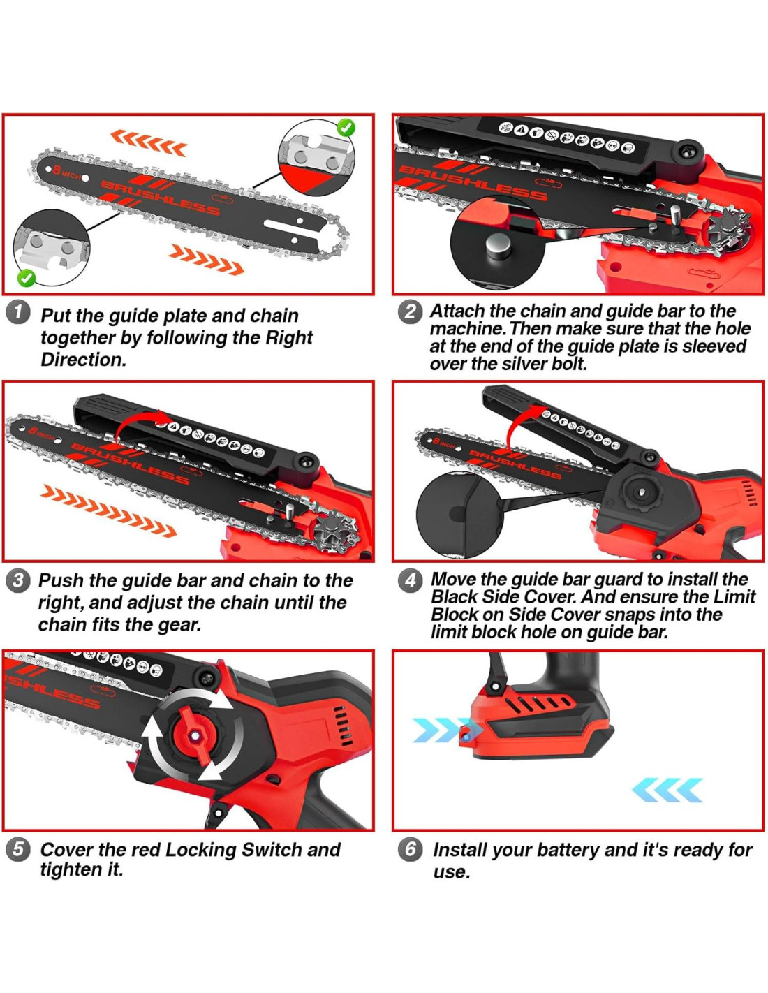 - Fácil de maniobrar: La compacta motosierra de poda permite un agarre y operación con una sola mano de manera fácil. Cuando necesite instalar o reemplazar la cadena, no requiere herramientas, solo ensamble la cadena y la barra en la posición adecuada, luego gire la perilla para fijar la motosierra.