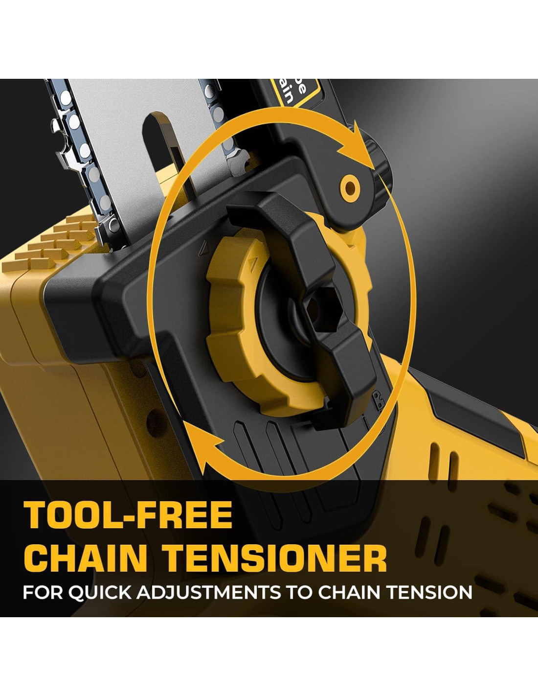 - TENSOR DE CADENA SIN HERRAMIENTAS: Acceso fácil al tensor de cadena para ajustes rápidos de la tensión de la cadena. La mini motosierra con tensión de cadena sin herramientas y perilla de bloqueo de barra facilita la instalación y el reemplazo de la cadena. No se necesitan herramientas en absoluto.