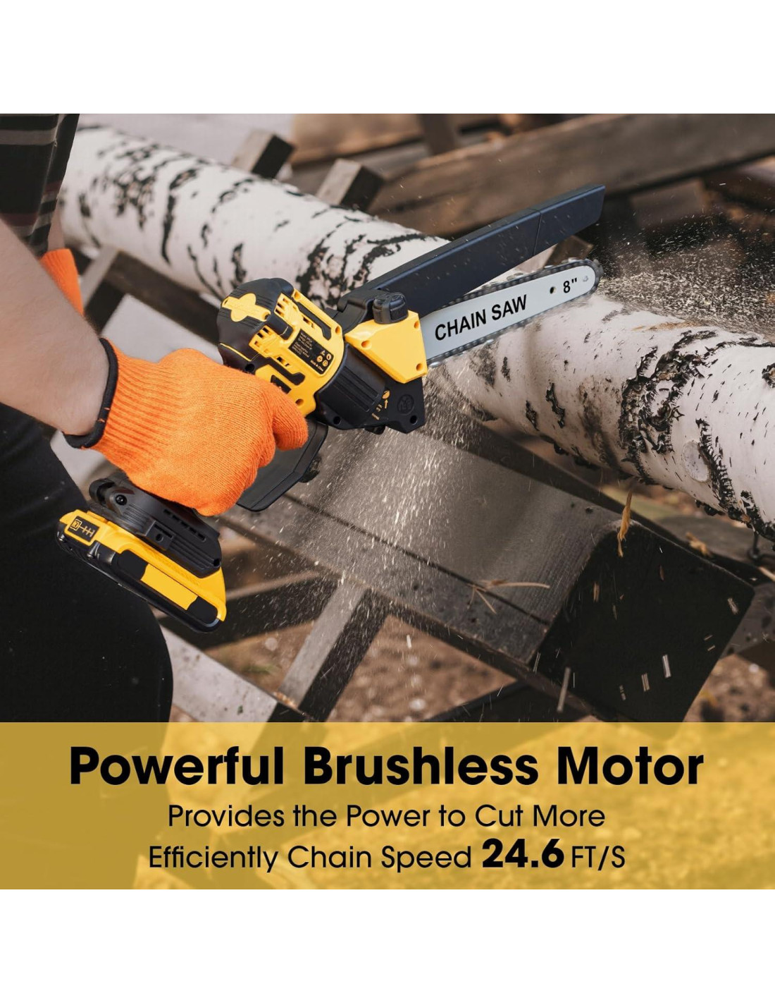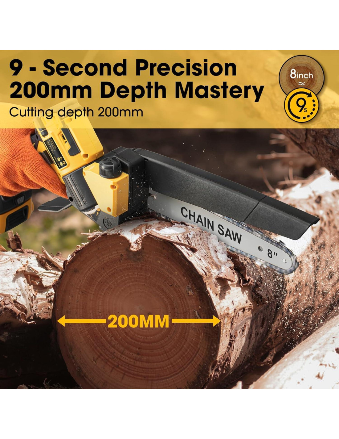 - Barra y cadena de 8 pulgadas para uso versátil: La combinación de barra y cadena de 8 pulgadas te proporciona la versatilidad que necesitas. Es perfecta para recortar ramas pequeñas a medianas en tu jardín, cortar leña para tu chimenea, o incluso crear pequeños proyectos de madera. Este tamaño logra el equilibrio adecuado entre maniobrabilidad y capacidad de corte, haciéndola adecuada para una amplia gama de aplicaciones. Sé creativo y asume cualquier tarea de corte de madera con confianza usando nuestra mini motosierra.