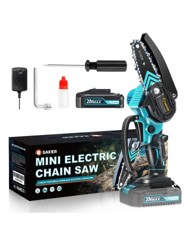 - [FÁCIL DE TRANSPORTAR] - Pequeña y conveniente, rápida y fácil de ensamblar, solo necesita 1 minuto para toda la instalación. La sierra de cadena de mano Smartsaker también es conveniente para las mujeres. Puedes obtener una sierra de cadena de 10.16 cm (4 pulgadas), una batería, un cargador, una pequeña botella de aceite lubricante, un destornillador y una llave.