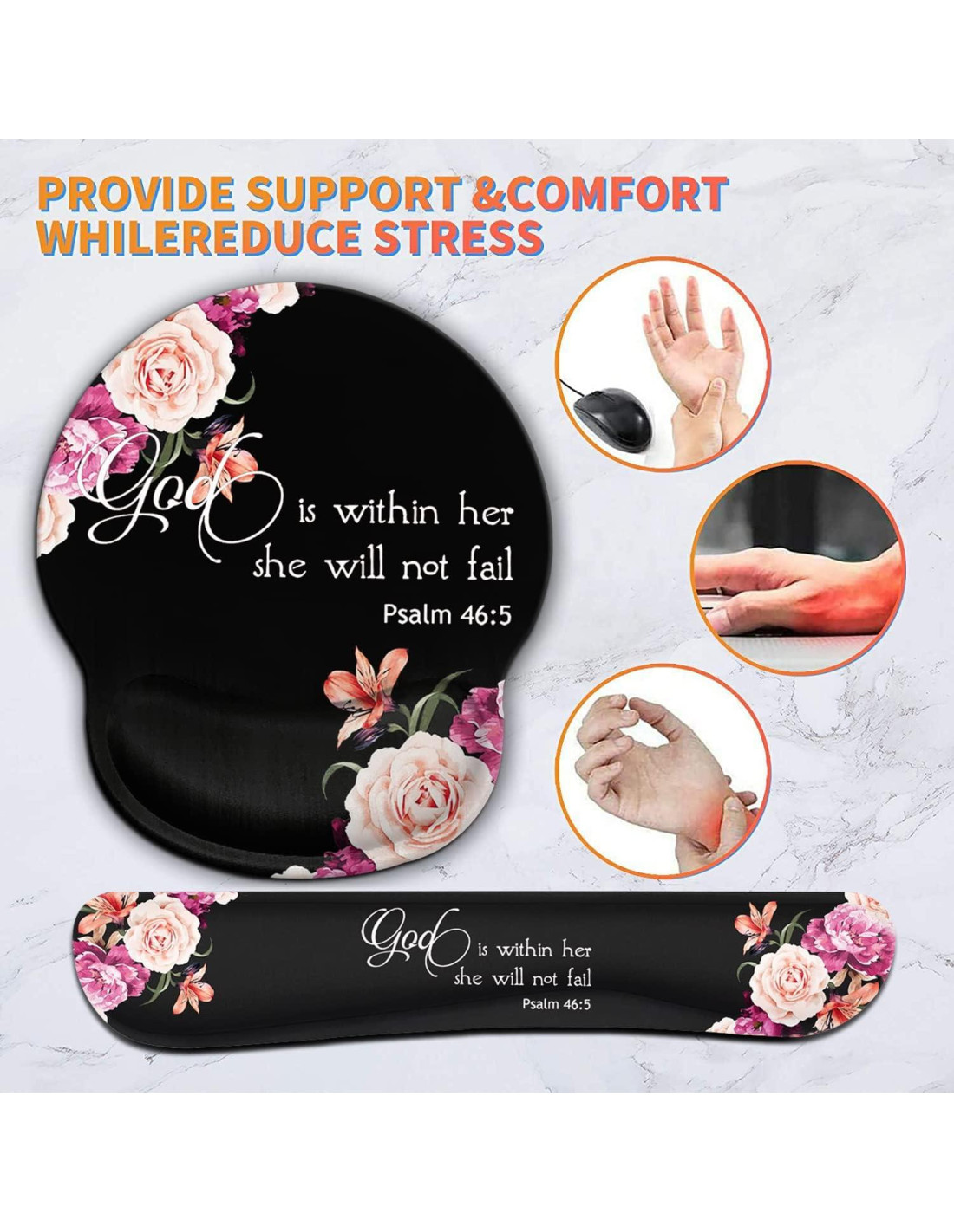 Almohadilla para muñeca de teclado y almohadilla para mouse con soporte ergonómico para muñeca, almohadilla para mouse con base antideslizante cómoda con espuma viscoelástica elevada para una fácil escritura y alivio del dolor, portátil, computadora, oficina, en casa o en el trabajo. ¿Has sentido tus manos, muñecas y brazos doloridos o rígidos después de un día entero de trabajo? ¿Sabías que la forma incorrecta en que usas la computadora puede dañar tu muñeca? ¿Estás buscando un conjunto único de almohadilla para mouse y soporte para muñeca de teclado? ¡Has llegado al lugar correcto! Material: Almohadilla para mouse: tela + gel + goma PU Almohadilla para muñeca de teclado: tela + espuma viscoelástica + goma natural Tamaño: Almohadilla para mouse de gel: 25 x 22 x 2 cm Almohadilla para muñeca de teclado: 45 x 8.6 x 2 cm Características: Esta almohadilla para mouse es no tóxica, sin mal olor, sin daño a tu salud. Borde reforzado, previene deformaciones o daños, garantiza una larga vida útil. Superficie de almohadilla para mouse muy suave, permite que tu muñeca se mueva libremente. Nuestras almohadillas para mouse están llenas de espuma viscoelástica de excelente calidad, se adaptan a tu muñeca para máxima comodidad y soporte, ayudan a aliviar el dolor, previenen el síndrome del túnel carpiano. Base antideslizante de goma/goma PU, mantiene la almohadilla para mouse y el soporte para muñeca de teclado firmemente en su lugar, asegura una operación estable del mouse. Material impermeable y transpirable, suave al tacto, fácil de limpiar. Impresión por transferencia de calor, se puede limpiar repetidamente, fácil de secar, nunca se desvanece. Contenido del paquete: 1 x almohadilla para mouse de muñeca 1 x soporte para muñeca de teclado 1 x posavasos de taza.