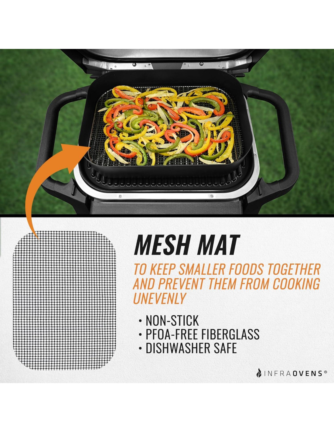 Este conjunto de alfombrillas reutilizables es compatible con la parrilla exterior ninja woodfire XL, ProConnect XL, más específicamente con la plancha. (Ninja, Woodfire son marcas comerciales o marcas registradas de sus respectivos propietarios. INFRAOVENS no está asociado con, ni respaldado por ellos). Usa la alfombrilla reutilizable para proteger tu plancha y sartén de residuos y para cocinar directamente sobre ella, especialmente para que tipos de alimentos más pegajosos o líquidos se cocinen más fácilmente mientras protegen tu parrilla exterior y ahumador. Usa la alfombrilla de malla para crear una capa uniforme para ciertos tipos de alimentos que de otro modo caerían a través de las ranuras de la plancha. La malla permite que el aire circule mientras cocinas tu comida a la perfección. Usa la alfombrilla perforada para cocinar tus comidas favoritas mientras permites que el aire continúe circulando. Recibe un folleto con 10 deliciosas recetas dulces y saladas e instrucciones sobre cómo usar las alfombrillas. Esto te ayudará a comenzar a usar las alfombrillas reutilizables en tu parrilla woodfire (en la función de freidora de aire). Los accesorios reutilizables y las alfombrillas para parrilla son aptos para lavavajillas, antiadherentes, fáciles de usar y fáciles de limpiar. Son la adición ideal a tu parrilla ninja woodfire pro connect XL. Hechas de fibra de vidrio libre de PFOA que es duradera y facilita la limpieza. Hecho por Infraovens. Alfombrillas para PLACA DE PLANCHA Guía de Cocción XL Estante de Acero Inoxidable XL Guía de Cocción + Bandeja de Goteo Guía de Cocción + 2 Estantes Paquete de Bandeja de Goteo (2-Pack) Conjunto de Horneado