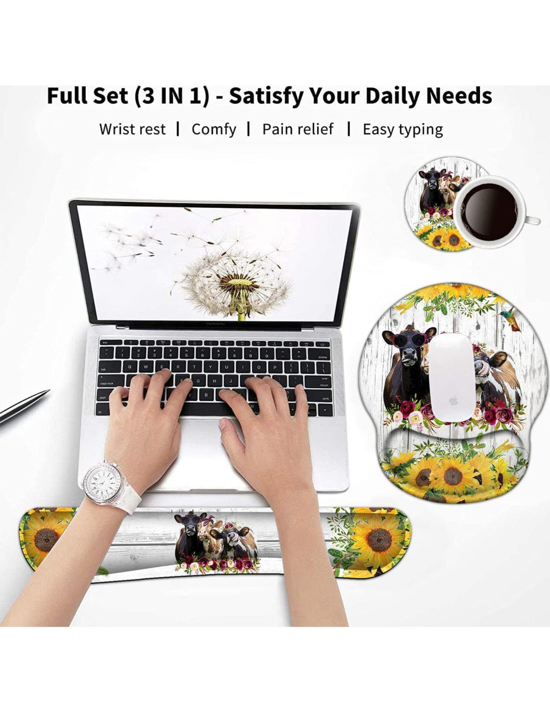 - [Tamaño óptimo 3 en 1] : El reposamuñecas de teclado mide 44 cm x 8.5 cm x 2.5 cm, el soporte de la alfombrilla de ratón 25 cm x 22 cm x 2.5 cm, y el posavasos es de 10 cm x 10 cm. Este es un combo de reposo para teclado y ratón que se adapta perfectamente a todo tipo de ratones o escritorios, ayudándote a aliviar el dolor o la fatiga de la muñeca al proporcionarte una sensación de alivio y relajación, previniendo lesiones nerviosas musculares o de muñeca.