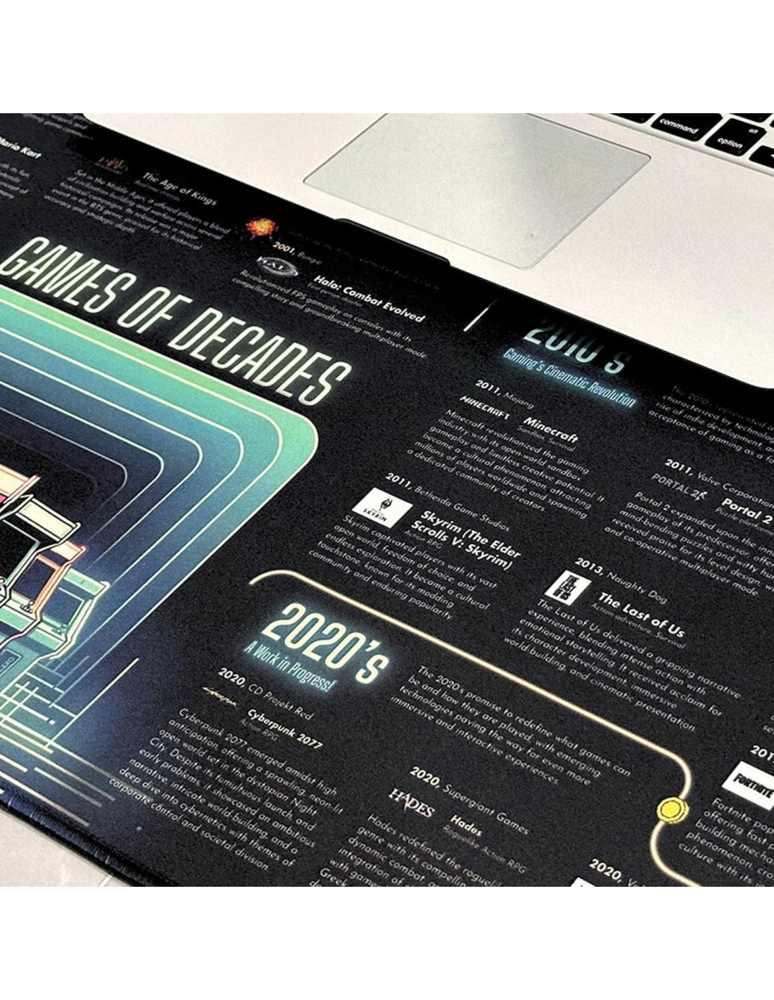¡Las infografías se enamoraron de las alfombrillas de escritorio! ¿Qué pasaría si la humilde alfombrilla de escritorio pudiera ser nuestro lienzo para aportar más a tu configuración? Creemos que las alfombrillas tienen mucho más potencial como puntos focales de nuestros escritorios. Pueden entrenar, inspirar, enseñar e incluso relajarnos. Pueden ayudarnos a construir nuevos hábitos. Sí, nuestras alfombrillas tienen las mejores características como suela de goma antideslizante, bordes cosidos y superficie de precisión para tu ratón, pero vamos mucho más allá. Existimos para mejorar tu estación de batalla. Nostalgia de los juegos desde los años 70 hasta hoy. Alfabetización financiera y técnicas de inversión para todos. Construye nuevos hábitos con una curaduría de los mejores del mundo. Los atajos de teclado más útiles en una hermosa escena. Inspírate con las mayores maravillas del mundo. Revive la Historia de los Videojuegos con Nuestra Alfombrilla de Ratón Grande 'Juegos de Décadas'. Juegos de Décadas: 70s - Pong, Space Invaders, Zork. 80s - Pac-man, Donkey Kong, Tetris, Mario, Buscaminas, Príncipe de Persia. 90s - Sonic, Monkey Island, Street Fighter, StarCraft, Legend of Zelda, Age of Empires, Tony Hawk's, Doom 00s - Sims, Diablo, Max Payne, GTA San Andreas, WoW, Halo, Half-Life, Guitar Hero, Call of Duty, Assasin's Creed, Fallout, League of Legends. 10s - Minecraft, Skyrim, Portal, Dark Souls, Last of Us, Witcher, PUBG, Dota 2, Fortnite, God of War. 20s - Cyberpunk, Hades, Elden Ring, Baldur's Gate y muchos más. ¡Adéntrate en un mundo de nostalgia con nuestra Alfombrilla de Ratón Grande para Juegos, celebrando los juegos icónicos que definieron cada década desde los años 70 en adelante! Diseñada para el verdadero entusiasta de los juegos, esta Alfombrilla de Ratón Grande para Escritorio mide impresionantes 35.4 x 15.7 pulgadas (90cm x 40cm), proporcionando amplio espacio para tu teclado y ratón. Ya sea que estés jugando, trabajando o navegando, esta alfombrilla de escritorio extendida aporta estilo y función a cualquier configuración. Esta Alfombrilla de Ratón para Juegos 'Juegos de Décadas' para Escritorio Grande presenta un diseño impresionante inspirado en los mejores juegos de la historia, convirtiéndola en la adición perfecta a cualquier estación de juegos retro o moderna. Fabricada con un tejido microtejido superior, ofrece una superficie de precisión que garantiza movimientos suaves y precisos del ratón. Junto con una base de goma antideslizante duradera, esta alfombrilla de ratón de alto rendimiento para juegos garantiza estabilidad, incluso durante las sesiones de juego más intensas. Ideal tanto para jugadores casuales como para profesionales, esta alfombrilla de escritorio para juegos grande es más que una alfombrilla de alto rendimiento para juegos: ¡es una pieza de la historia de los videojuegos! Ya sea que estés navegando por los clásicos de los años 70 o los títulos de vanguardia de hoy, esta alfombrilla de escritorio para juegos extendida ofrece el espacio, la comodidad y la precisión que necesitas para rendir al máximo. Eleva tu escritorio con la alfombrilla de ratón grande para juegos, bordes cosidos duraderos y mucho espacio para todo tu equipo. Abraza el espíritu de los juegos a través de las décadas y convierte tu espacio de trabajo en un tributo a la edad dorada de los videojuegos con esta alfombrilla de escritorio.