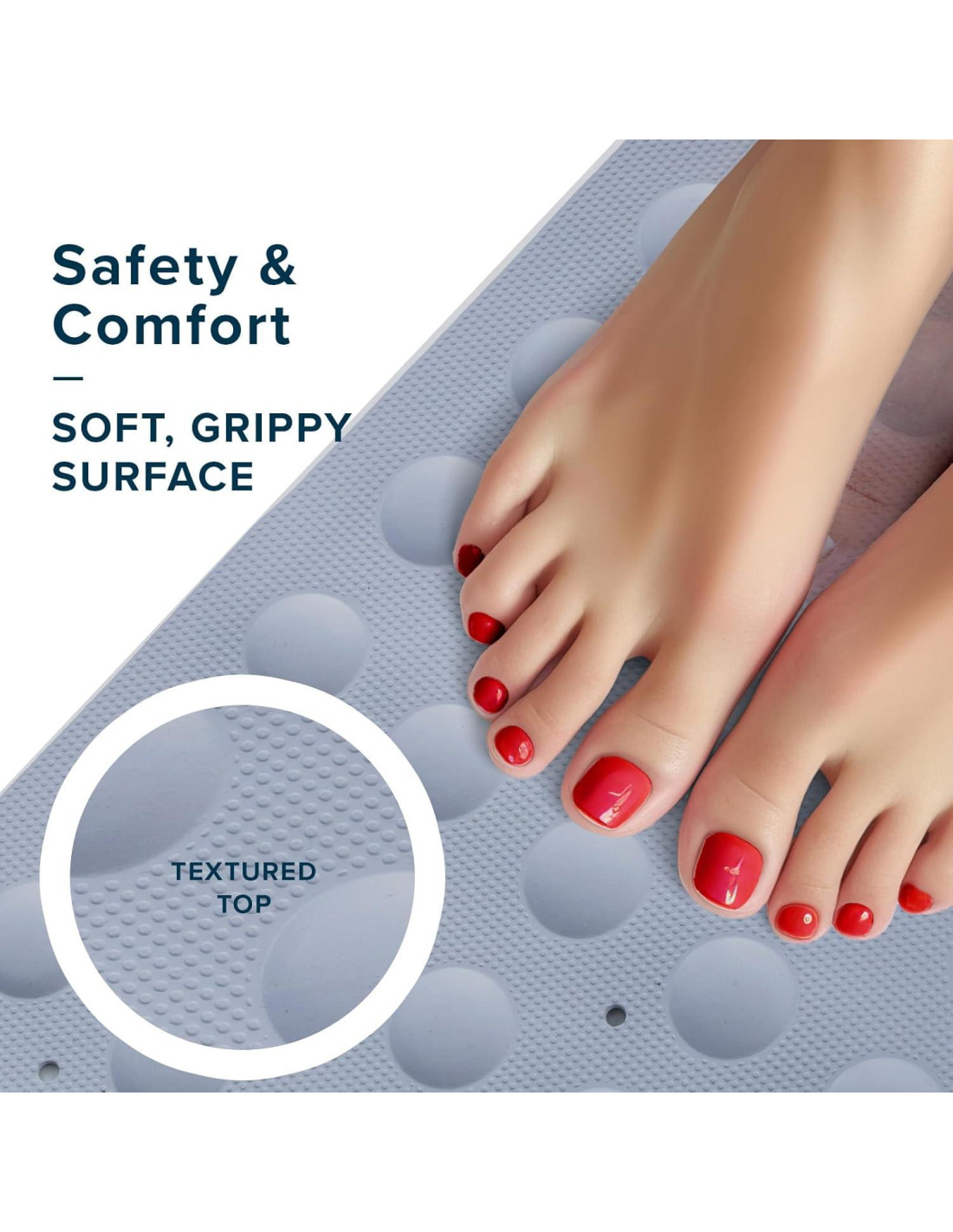 - Protección de Producto Incorporada: La única alfombrilla de ducha de caucho con protección de producto incorporada para ayudar a prevenir acumulaciones y olores no deseados, manteniendo su espacio de baño más fresco por más tiempo.