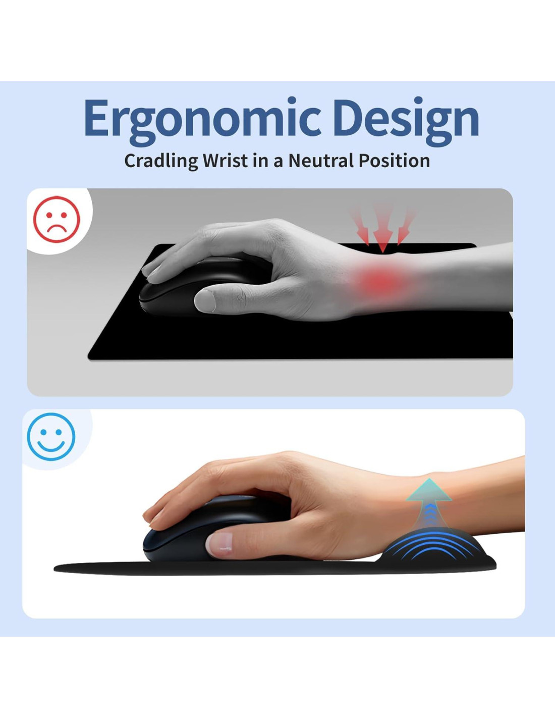 - Alfombrilla de Ratón Ergonómica: El soporte para muñeca ergonómico está relleno de gel suave que proporciona un tacto cómodo y un soporte efectivo para tu muñeca, reduciendo el dolor y la fatiga causados por horas prolongadas de movimiento repetitivo y aliviando o evitando el síndrome del túnel carpiano