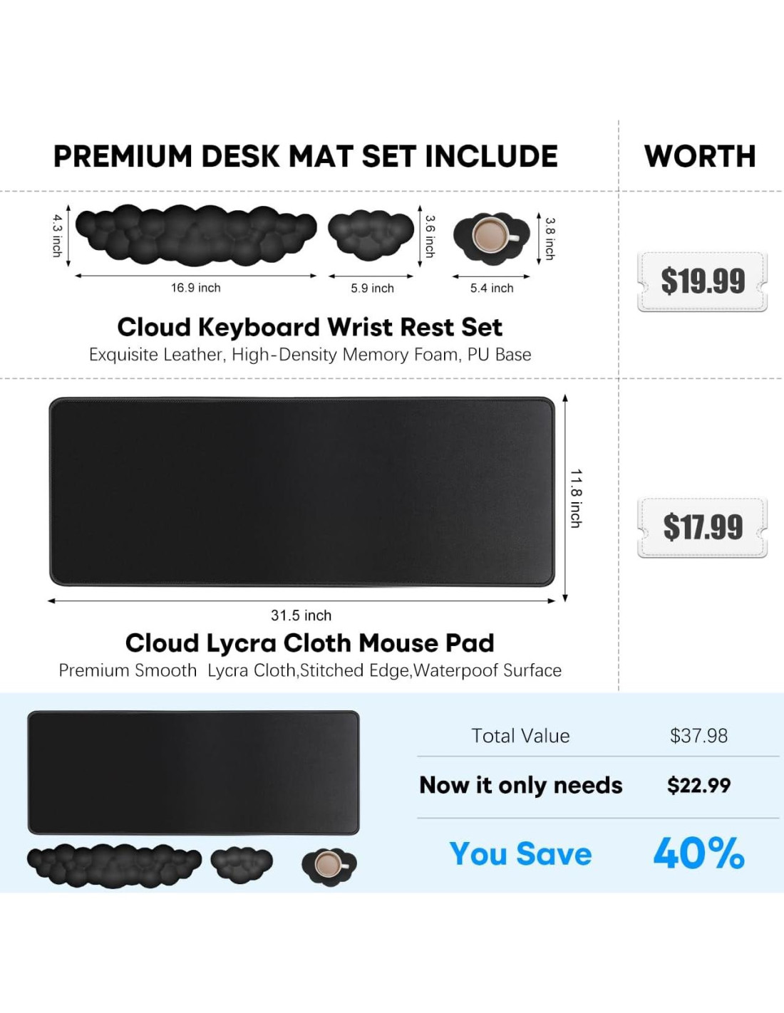 - [Conjunto de Almohadilla de Muñeca Nube 4-en-1] Incluye 1 alfombrilla de ratón XL que mide 80x30 centímetros para proporcionar amplio espacio para acomodar tu ratón de juego, teclado mecánico de tamaño completo y otros artículos de escritorio, 1 almohadilla de muñeca para teclado en forma de nube, 1 almohadilla de muñeca para ratón en forma de nube, 1 almohadilla para taza en forma de nube