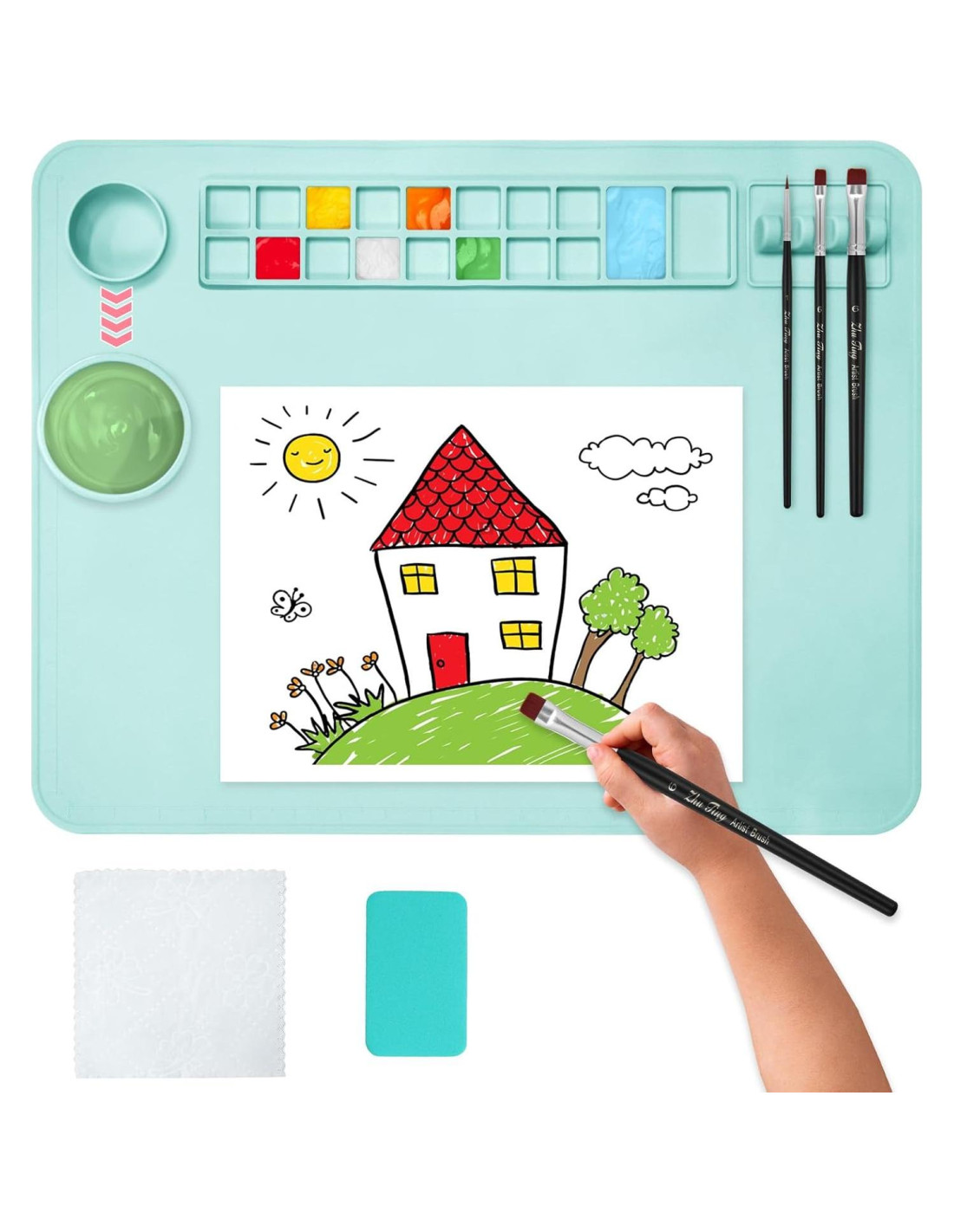 - [Alfombrilla de Silicona Grande] : La alfombrilla de artista de silicona con taza de bebida mide 50 cm x 40 cm, con bordes ligeramente elevados para mantener todo en la alfombrilla de arte.