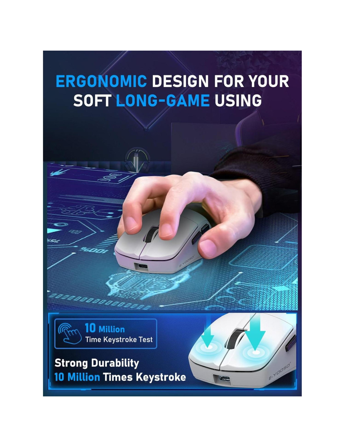 - [Diseño Ergonómico Ultra-Ligero de 50g]: Diseñado para maratones de juego y largas jornadas laborales, nuestro ratón gaming ligero reduce la tensión en la muñeca con un agarre contorneado y pies de PTFE suaves para un deslizamiento sin esfuerzo sobre cualquier superficie
