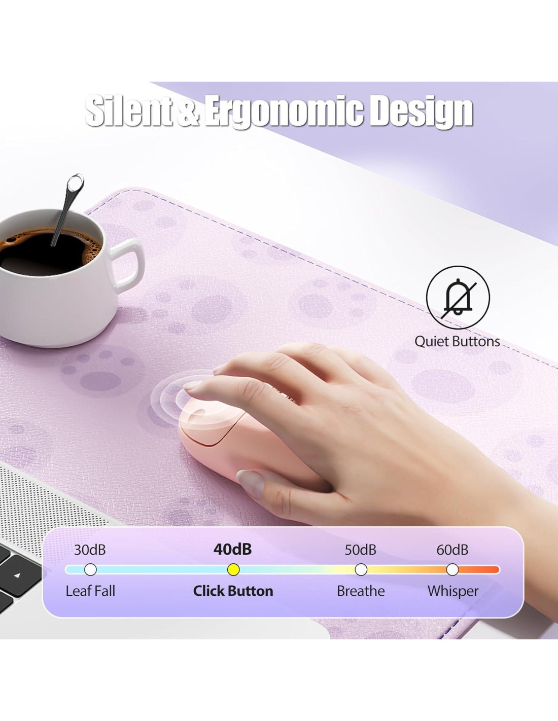 Diseño único de patita de gato kawaii, con rueda de desplazamiento de metal dorado y botón DPI dorado, 5 colores brillantes diferentes disponibles. 4 botones estándar, 3 niveles DPI, 800/1200/1600, tasa de sondeo de 250Hz. 2.3oz (65g) ligero y portátil. Un gran ratón de oficina que te brinda un uso cómodo y un estado de ánimo agradable en el trabajo. Conexión de doble modo potente que soporta inalámbrico 2.4GHz y Bluetooth 5.0/3.0. Puedes conectar hasta dos dispositivos bluetooth y un dispositivo inalámbrico 2.4G. Conéctate y cambia de dispositivos fácilmente con el botón de cambio de modo en la parte inferior. Distancia de trabajo de hasta 33ft (10m). Batería recargable de polímero de litio de 300mAh incorporada, el ratón se puede recargar fácilmente a través del cable USB-C suministrado. 2 horas de carga rápida completa se puede usar continuamente durante aproximadamente 24 horas, en espera durante 160 horas. El ratón entra en modo de sueño ligero en 60 segundos de inactividad para ahorrar batería, y en modo de sueño profundo en 30 minutos, cualquier movimiento lo despierta. Ratón silencioso que adapta un interruptor de menos ruido para ambos botones izquierdo y derecho, te permite concentrarte en tu trabajo sin molestar a los demás a tu alrededor. Se ajusta a la curvatura de la palma, la palma tiene soporte y no cuelga, reduce la presión y tensión que provoca el trabajo prolongado en la muñeca. Gran elección para el hogar, oficina, aula, dormitorio, biblioteca, etc.