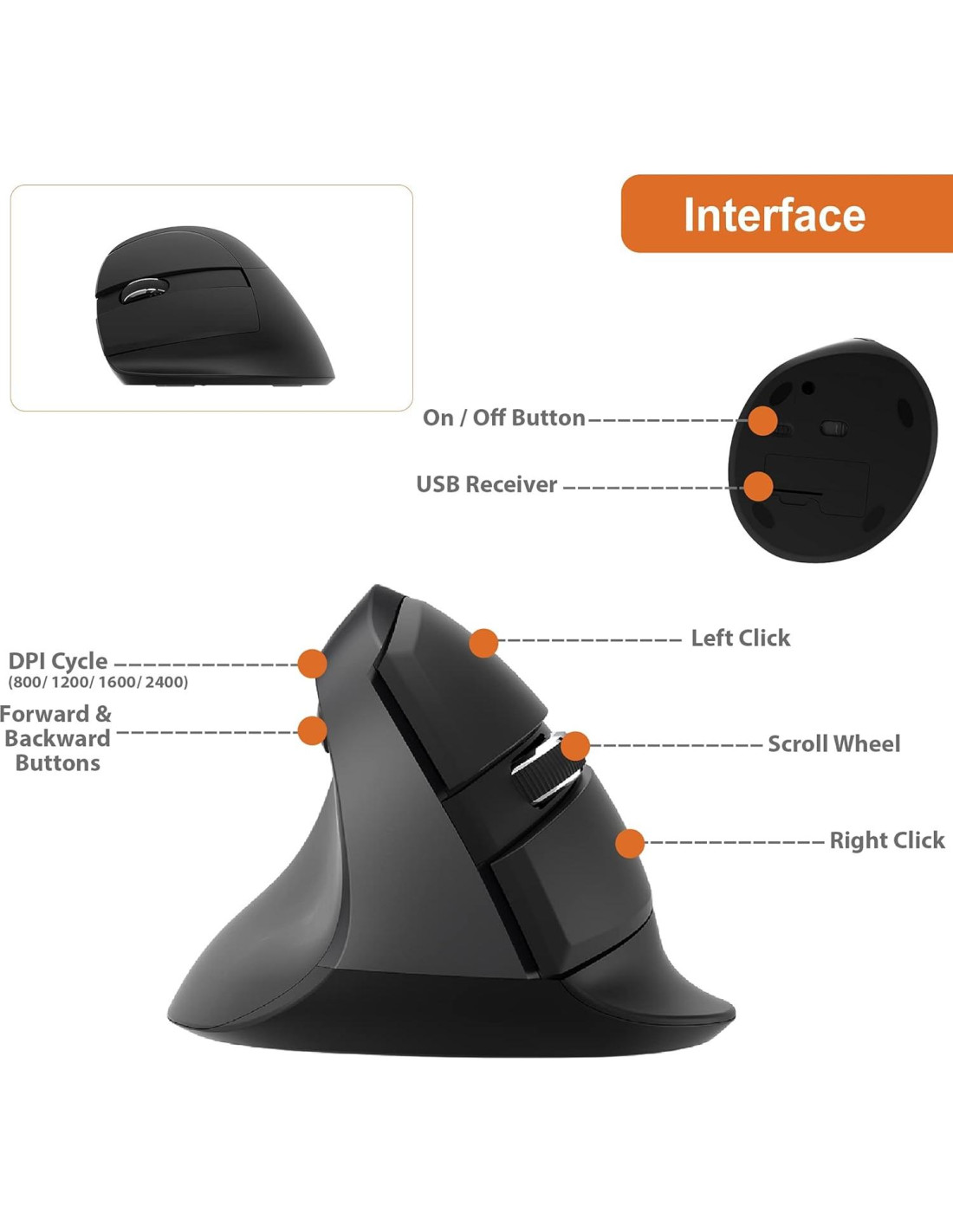 - Cambia entre las 4 configuraciones de DPI: 800/1200/1600/2400. El botón de cambio de DPI está convenientemente ubicado cerca de los botones de Avanzar y Retroceder, lo que hace que cambiar tus configuraciones de DPI en tu ratón vertical para la mano izquierda sea rápido y fácil.