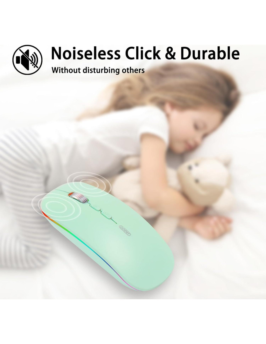 Ratón Inalámbrico Bluetooth de Doble Modo LED, Más conveniente, Más cómodo, Más diferente para ti. 1. Conexión de Doble Modo Receptor Nano USB & Tecnología de Transmisión Inalámbrica Bluetooth 5.1, Te proporciona más de una opción de conexión. 2. DPI Ajustable 3 niveles de DPI (800/1200/1600), puedes ajustar libremente el DPI del ratón inalámbrico para adaptarlo a tu hábito de uso. 3. Ratón Recargable y Duradero No necesitas reemplazar la batería más. Carga una vez, trabaja durante 2 meses. deshazte del cable y disfruta de la libertad. 4. Luz LED Colorida que Respira Este ratón recargable proporciona un efecto de luces que respiran alternadamente y lentamente, añadirá algo de diversión y color al trabajo y la vida aburridos. 5. Amplia Compatibilidad y Fácil de usar. El ratón es compatible con la mayoría de los sistemas, incluyendo Windows, Mac y Linux. Una vez emparejado, se reconectará automáticamente. 6. Delgado y Portátil - Ideal para negocios y viajes Diseño portátil, fácil de llevar. se puede poner fácilmente en un bolsillo o bolsa, y no ocupará demasiado espacio. Buena elección para negocios, escuela. 7. Diseño Silencioso Ratón Bluetooth con clic silencioso, que reduce el sonido del clic en un 90% en comparación con los ratones de computadora tradicionales, lo que lo hace ideal para cualquier ocasión.