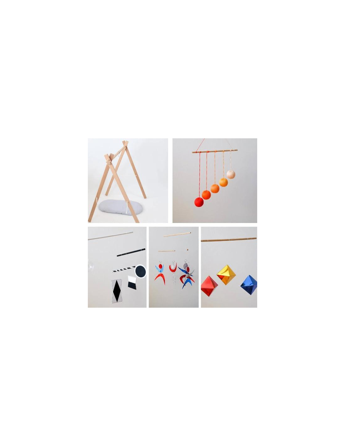 Mis productos están inspirados en la filosofía de Maria Montessori. Están preparados con materiales amigables para bebés en tamaños recomendados. Este conjunto consta de 4 móviles. -Móvil Munari (3-6 semanas): Su bebé solo puede ver colores contrastantes en las primeras semanas. Realizan estudios de percepción visual y desarrollo mental con el móvil Munari. -Móvil Octaédrico (5-8 semanas): Los bebés comienzan a ver el color rojo a partir de la quinta semana. El octaedro les ayuda tanto con los colores como con los primeros pasos en matemáticas. Gracias a los brillantes octaedros, su bebé se divertirá mientras aprende. -Móvil Gobbi (8-10 semanas): Cuando su bebé tiene 2 meses, ahora es consciente de muchos colores. Es maravilloso conocer todos los colores de la naturaleza. Su bebé aprende conceptos como de lejos a cerca, de atrás a adelante, de abajo a arriba. El ligero Gobbi ayuda a su bebé a tener un tiempo agradable. -Móvil Dancer (9-12 semanas): Los bailarines móviles giran tanto sobre su propio eje como alrededor del aparato. Mientras su bebé los observa, se vuelven activos y comienzan a charlar.