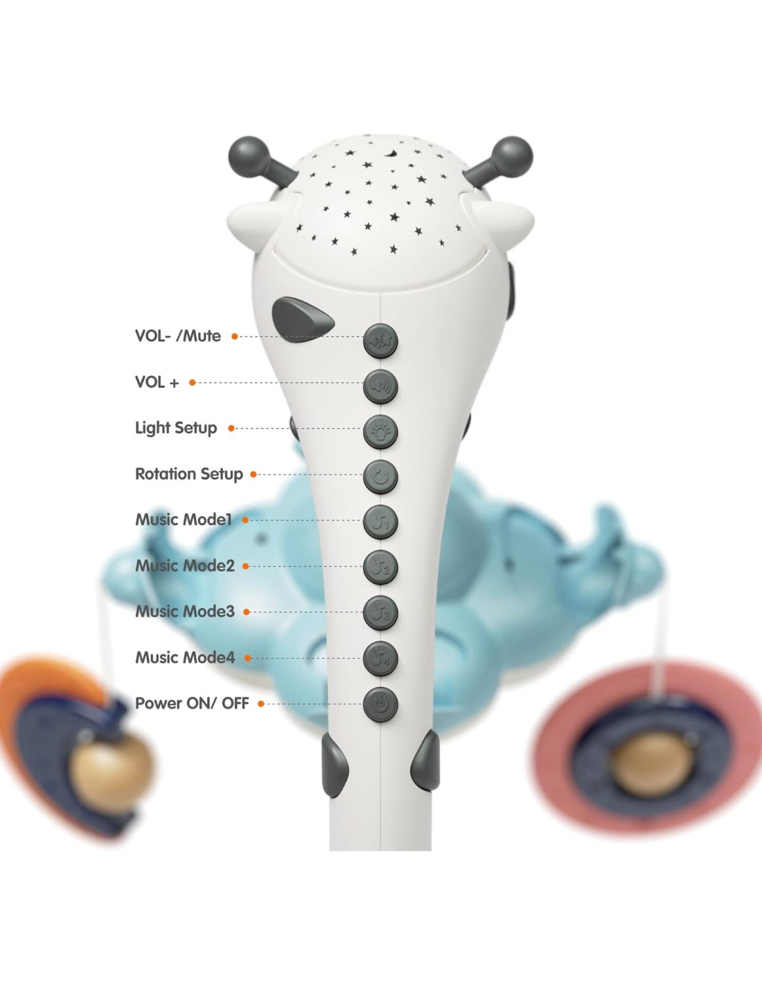 - CONTROL REMOTO Y TEMPORIZACIÓN INTELIGENTE: Para ahorrar energía, las luces se apagarán y dejarán de girar 5 minutos después de que la canción haya terminado y todas las funciones hayan finalizado. Si no hay operación durante otros 25 minutos, el móvil se apagará automáticamente. Con un control remoto en forma de hongo, puedes subir/bajar el volumen, encender/apagar la música, luces o motor giratorio en cualquier lugar y en cualquier momento, incluso puede tenerlo muy silencioso o a un nivel razonable para que el bebé duerma. Además, puedes apagar el móvil para bebés con el control remoto, (NOTA: NO SE PUEDE ENCENDER EL MÓVIL CON EL CONTROL REMOTO)