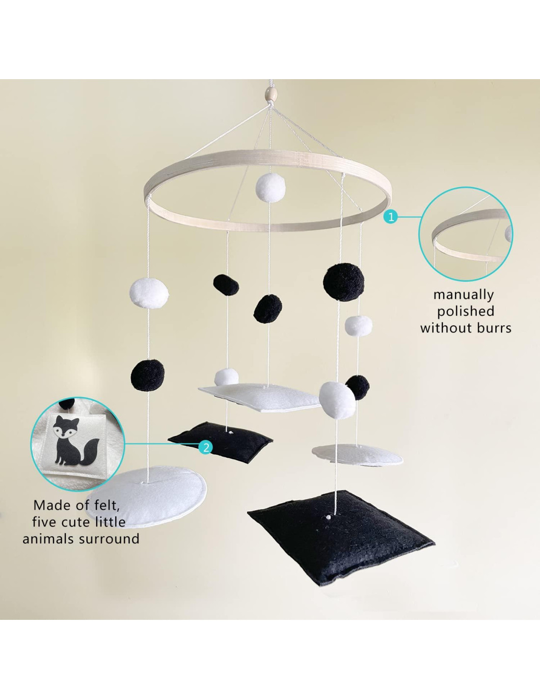 - Diseño Único: el animal de nuestro móvil Montessori está orientado hacia la cara del bebé, el bebé ya no está mirando hacia el fondo del móvil de cuna. Incluye cinco bonitos animales del bosque: zorro, mapache, búho, oso y ciervo