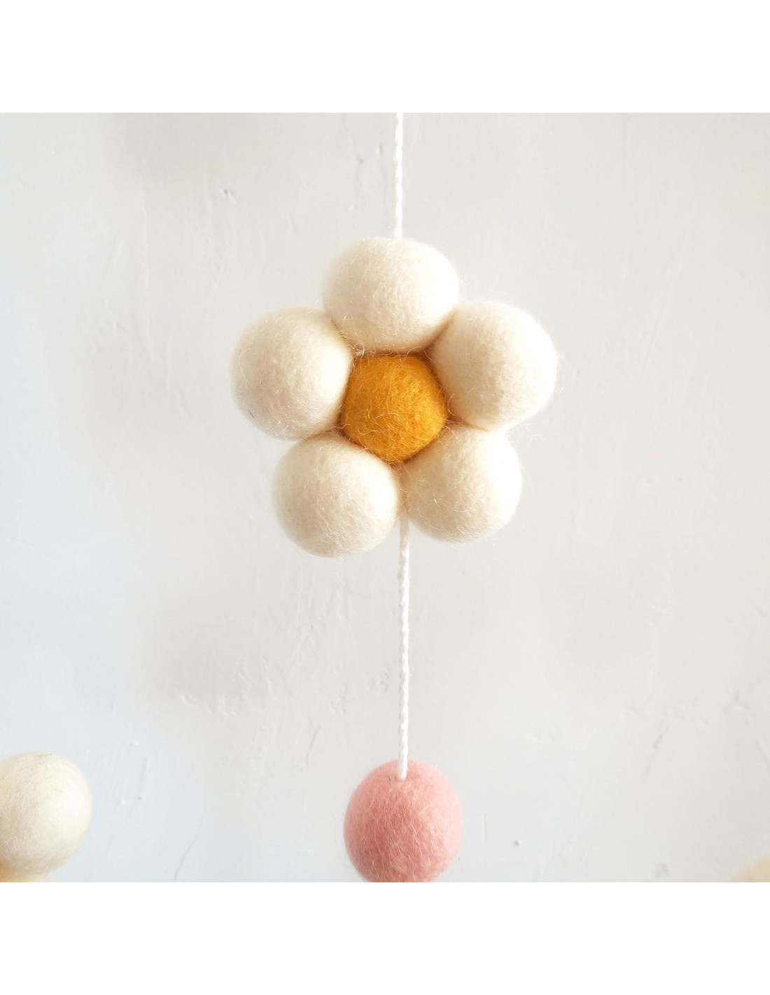 - Mejora la habitación de tu bebé con el móvil de juguetes para cuna GOUKURLSMA, diseñado para crear una atmósfera relajante mientras estimula los sentidos de tu bebé con suaves rotaciones de 360 grados. La parte superior del móvil para moisés es un anillo de madera de haya suave, con delicadas bolas de fieltro rosa colgando del marco de madera. Margaritas blancas están entrelazadas con estas bolas de fieltro rosa.