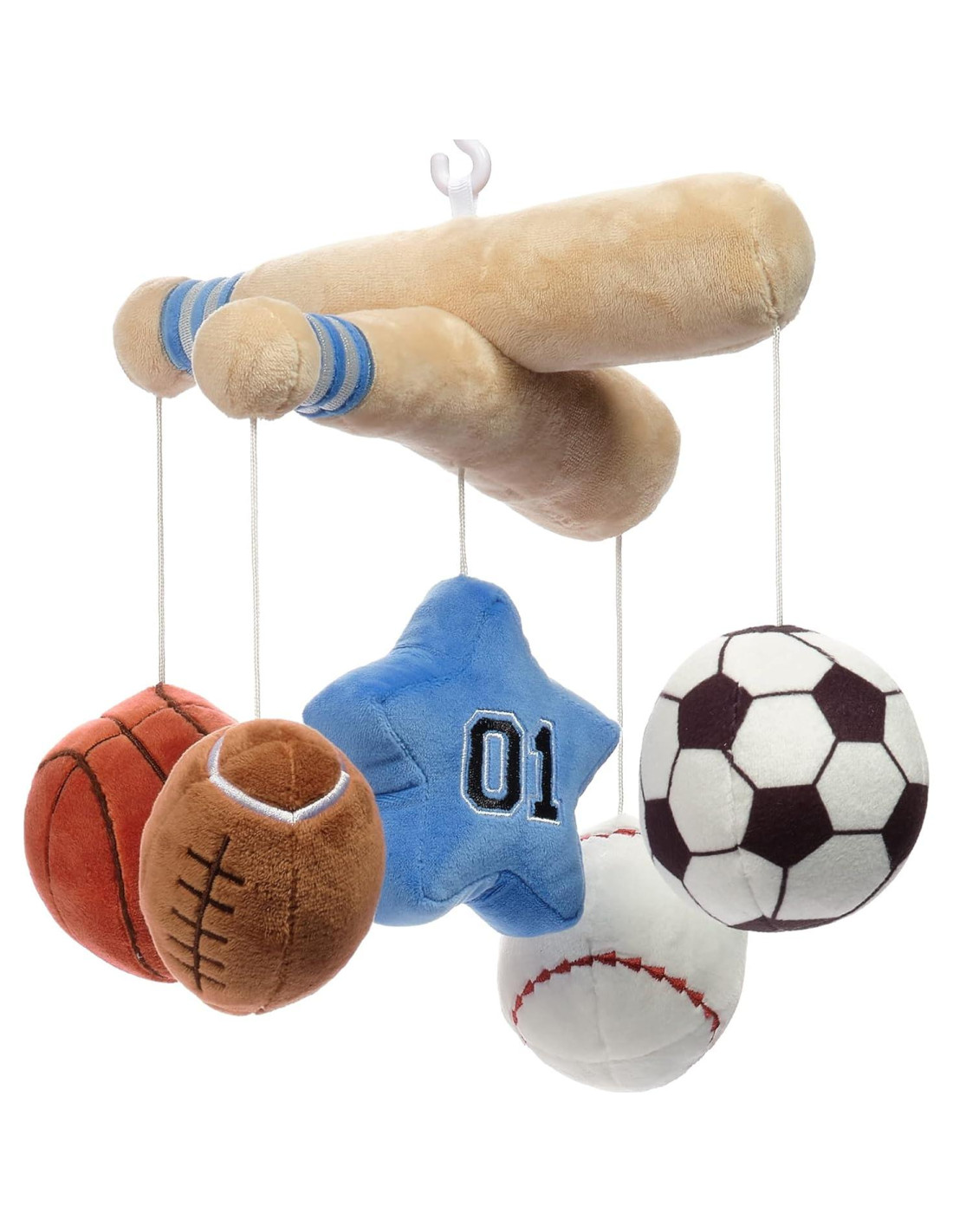 Este único móvil musical para cuna tiene bates de béisbol diseñados a medida como las barras transversales en la parte superior del móvil. Están hechos de un color crema de terciopelo con detalles aplicados y bordados. Lentamente rotando debajo de los bates de béisbol hay un baloncesto de terciopelo, un balón de fútbol americano de color marrón, un balón de fútbol blanco y negro, un béisbol de terciopelo blanco y una estrella bordada azul. El scrunchie, que cubre el brazo del móvil, es de terciopelo gris. Este móvil musical a pilas reproduce canciones de cuna durante 20 minutos, tiene un interruptor de encendido/apagado y control de volumen. Reproduce Brahms Lullaby, Twinkle, Twinkle Little Star y Rock-a-Bye-Baby. Requiere 3 pilas AAA no incluidas.