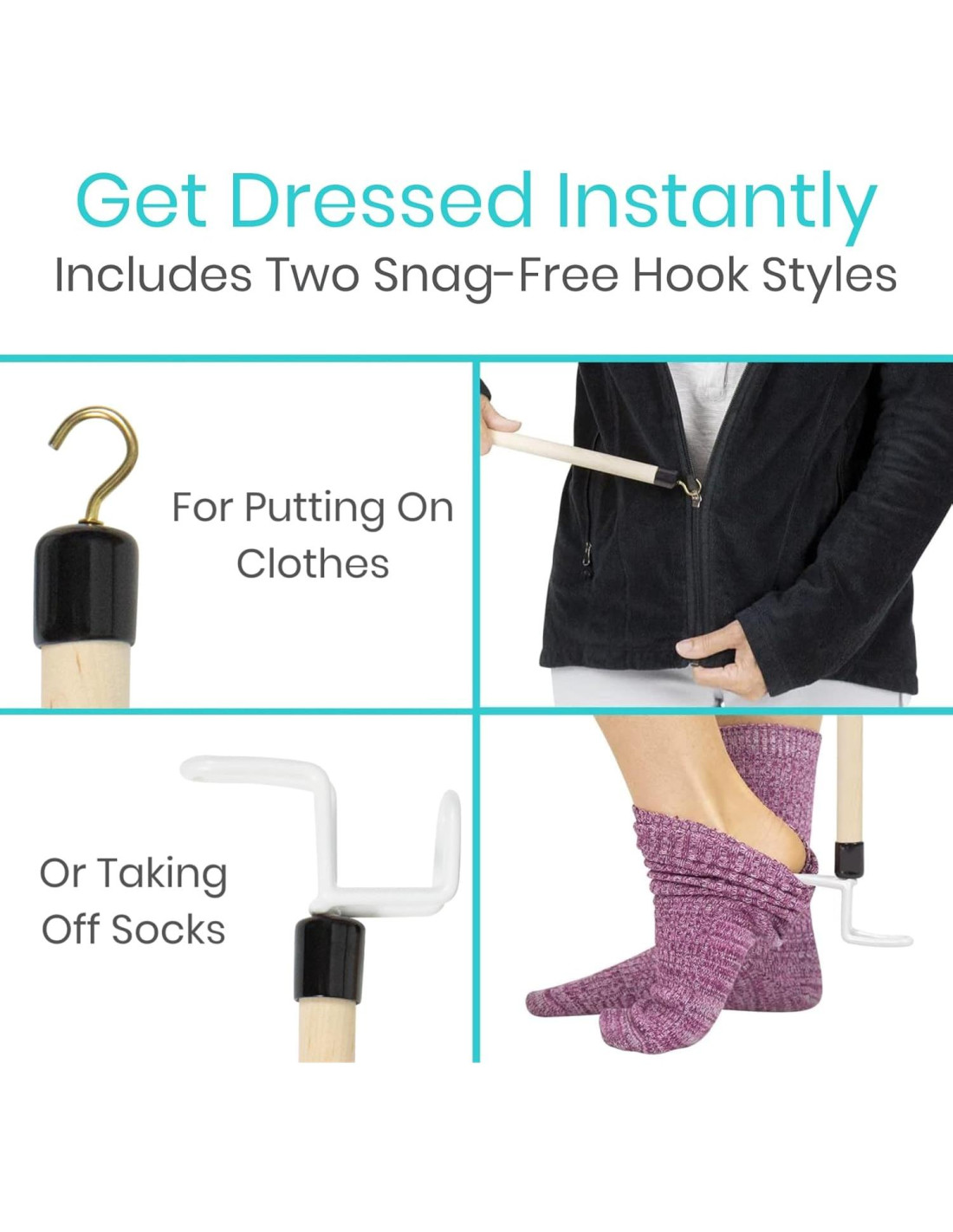 - VESTIRSE INDEPENDIENTEMENTE: Ya sea recuperándose de una cirugía de rodilla o cadera, sufriendo de artritis o teniendo movilidad o rango de movimiento limitado, el bastón para vestirse de Vive permite una mayor independencia al vestirse para el día. Perfecto para aquellos que tienen problemas para doblarse, girar o alcanzar detrás de ellos, el bastón para vestirse es adecuado para todas las prendas de vestir, incluidos pantalones y faldas, camisas y ropa interior, así como prendas exteriores como abrigos y chaquetas.