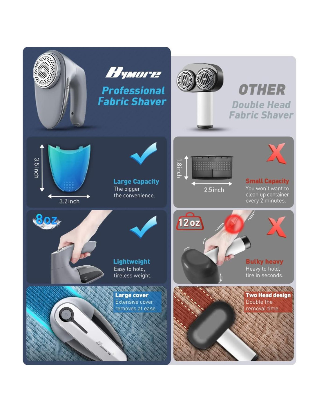 - INNOVACIÓN EFICAZ: ¿Tienes prisa por rejuvenecer tu ropa? La afeitadora de sudor Bymore combina 6 piezas de cuchillas afiladas de acero inoxidable y una cabeza de afeitado extra grande para un ángulo más amplio para eliminar de todas las telas con 9000 RPM de alta velocidad rotativa en poco tiempo