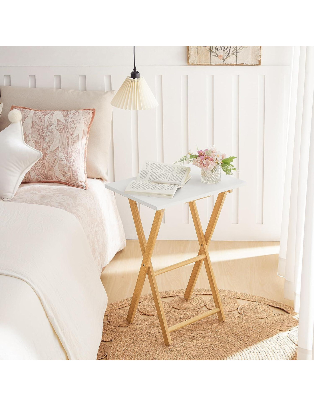 - Elegancia Exquisita: ¿Quieres tener una mesa lateral plegable elegante? Esta bandeja de TV puede satisfacer completamente tus necesidades. La parte superior blanca combinada con un marco de bambú natural crea una combinación de colores perfecta que puede integrarse perfectamente con cualquier decoración del hogar