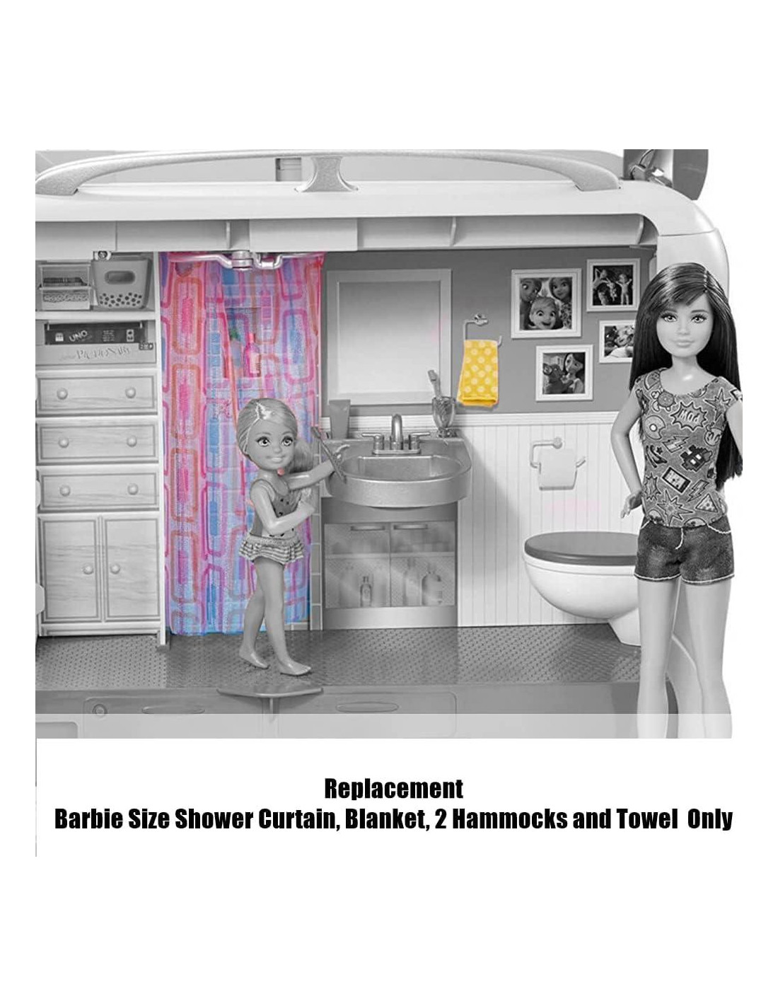 - INCLUYE Cortina de Ducha de Tamaño Barbie de Reemplazo, Manta, 2 Hamacas y Toalla