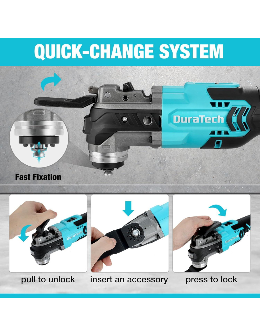 - 23 Accesorios y Sierra Oscilante Multiherramienta: El kit de herramienta oscilante DURATECH incluye: Sierra Oscilante*1, Cargador Rápido de 1 Hora*1, Batería de Li-ion*1, cuchilla de sierra de 3/4" (corte madera/plástico)*1, cuchilla de sierra bimetálica de 1-3/8" (corte madera/metal)*1, raspador*1, almohadilla de lijado triangular*1, hojas de lijado*15 (60, 80, 120 grano), Mango Lateral Auxiliar*1, Estuche de Transporte*1, manual*1. Una variedad de accesorios puede completar fácilmente muchos tipos diferentes de trabajo como recortar, lijar, raspar, cortar y pulir.