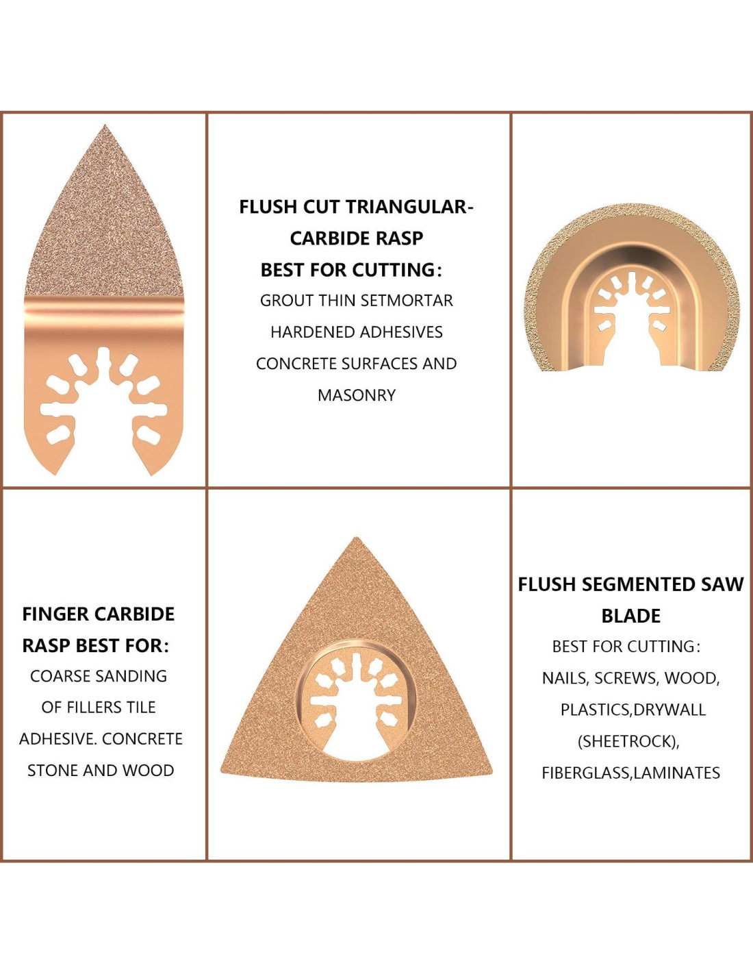 - [Buena Compatibilidad] Este conjunto de hojas de herramientas múltiples de carburo mixto es compatible con la mayoría de las marcas de herramientas oscilantes como Fein Multimaster, Ryobi, Hitachi, Chicago, Mastercraft, Milwaukee, Ridgid, Black & Decker, Rockwell, Dewalt, Einhell, Porter-Cable, Craftsman y más.