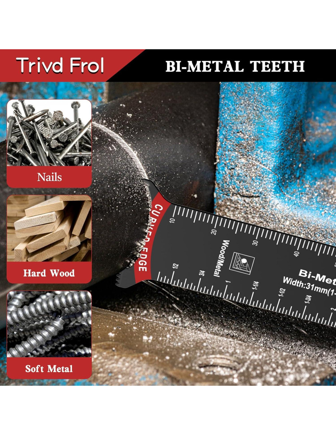 - [Dientes de Bi-Metal] : Las cuchillas de la herramienta oscilante están diseñadas para cortes rápidos y profundos en metal blando, madera con clavos y madera dura. La incorporación de dientes de bi-metal en la cuchilla refuerza su durabilidad y resistencia al desgaste.