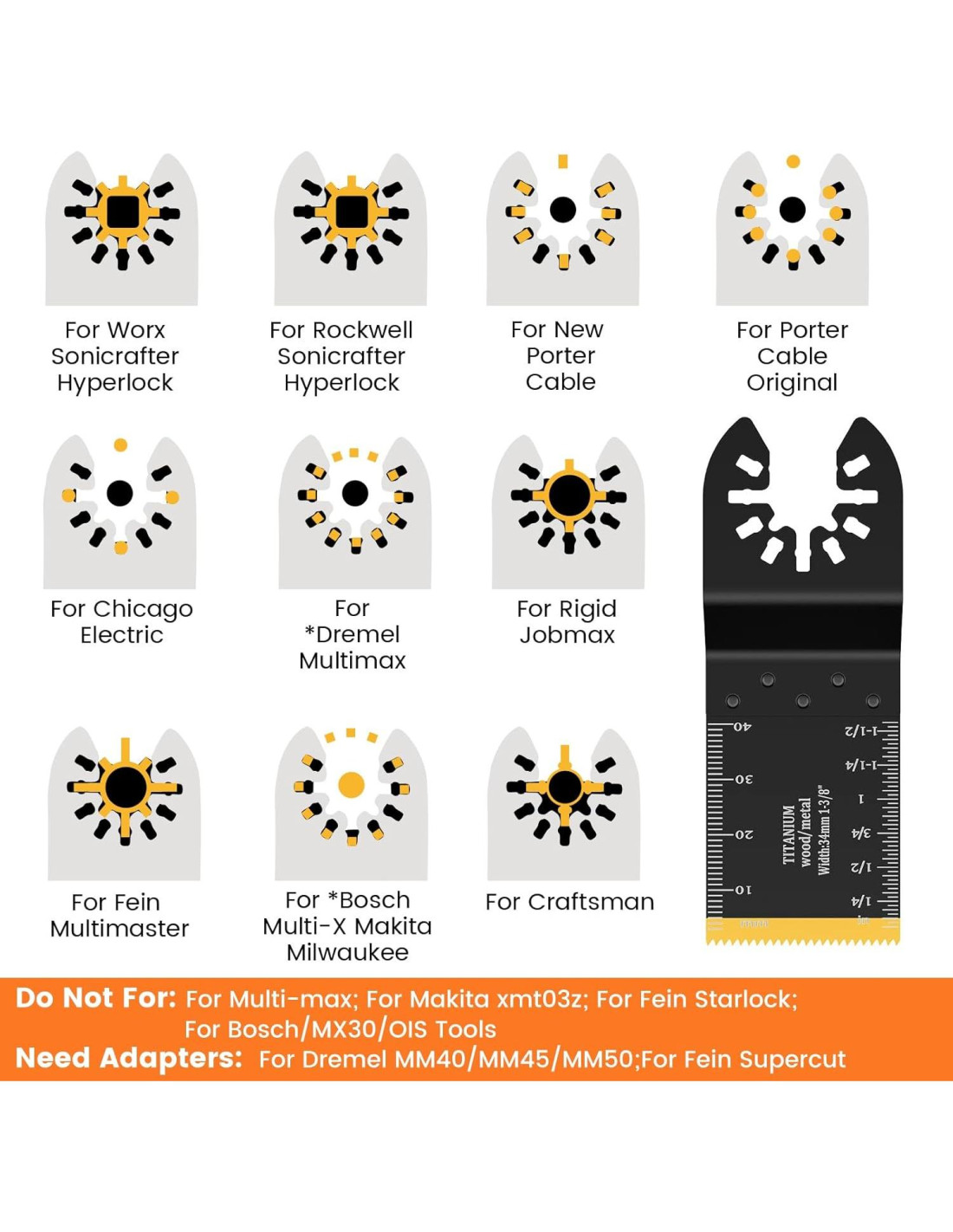 - Más Compatible: El sistema de interfaz universal se adapta a más del 95% de las herramientas oscilantes, incluyendo Milwaukee. NOTA: No se recomienda para el sistema de interfaz Starlock, Starlock Plus, y MM30, MM40 y MM50.
