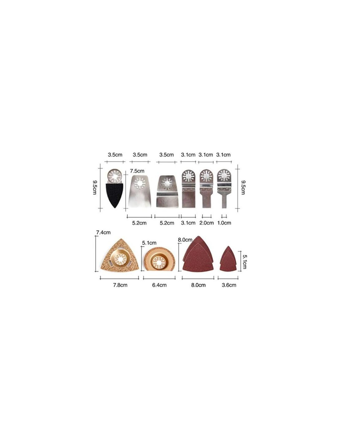 Características: Color: Como se muestra en la imagen Tamaño de papel de lija: 50 x 35 mm / 80 x 80 mm Granulometría del papel de lija: 40/80/120/180/240 (Cada tipo de tamaño es 4 piezas) Especificaciones: Compatible con Fein Multimaster, Dewalt, Ryobi, Chicago, Ridgid, Rockwell, Craftsman, Milwaukee, Black & Decker, etc. Compatible con muchas herramientas oscilantes No es compatible con Fein Starlock y Fein Supercut. No es compatible con herramientas de liberación rápida Dremel o Bosch. No es compatible con Bosch MX30, Dremel MM40 y MM45, Dremel Multi Max 6300. Se requiere adaptador para Rockwell y Worx (excepto Hyperlock). Contenido del paquete: 1 x hoja de dientes finos HCS de 10 mm 18TPI 1 x hoja de dientes finos HCS de 20 mm 18TPI 2 x hoja de sierra oscilante universal de precisión Japón de 35 mm 6 x hoja de sierra oscilante universal de dientes finos de 35 mm 2 x hoja de sierra oscilante universal de bi-metal de 35 mm 2 x hoja de sierra oscilante universal de precisión Japón de 44 mm 2 x hoja de sierra oscilante universal de bi-metal de 44 mm 2 x hoja de sierra oscilante universal de dientes finos de 44 mm 2 x hoja larga HCS de 55 mm 15TPI 2 x hoja de dientes finos HCS de 65 mm 2 x hoja de dientes gruesos HCS Japón de 65 mm 2 x hoja de dientes finos HCS de 90 mm 1 x almohadilla de lijado para dedos pequeña de 50 x 35 mm 1 x almohadilla de lijado delta grande de 80 x 80 mm 20 x hojas de lija de grado mixto pequeñas de 50 x 35 mm 40/80/120/180/240 20 x hojas de lija de grado mixto grandes de 80 x 80 mm 40/80/120/180/240