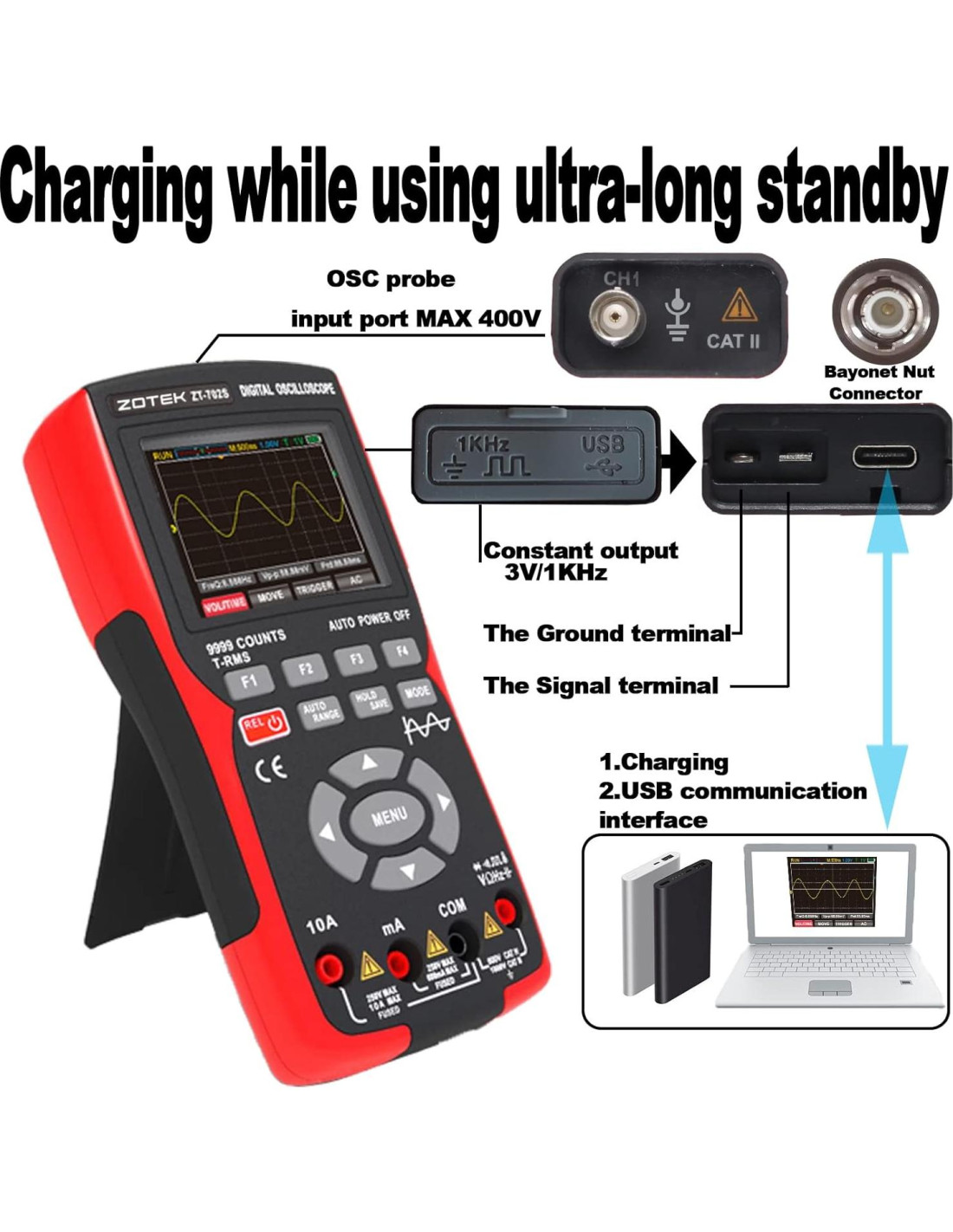- Diseño de modo dual de osciloscopio y multímetro: cambio de modo con un botón, obtención automática de forma de onda, calibración de base de tiempo, almacenamiento de datos, exportación de datos, selección de idioma, configuración de tiempo de apagado, retroiluminación ajustable, puerto de transmisión de datos, salida de onda cuadrada de 3V-1kHZ, memoria y otras funciones, fácil de operar, mejora la eficiencia del trabajo. Multímetro osciloscopio digital ampliamente utilizado en automoción, equipos industriales, sensores, equipos eléctricos pesados, acabados y sistemas de baja tensión.