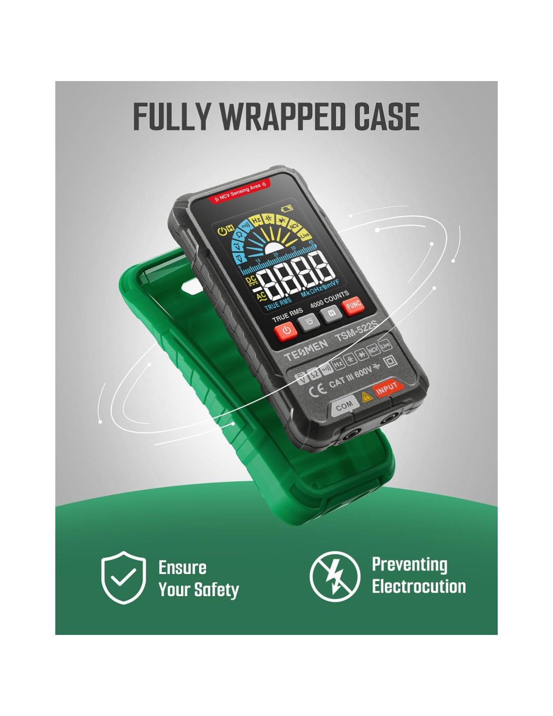 - Modo Inteligente y Manual: TESMEN TSM-522S TRMS 4000 cuentas es un multímetro inteligente que combina funciones automáticas y manuales. El modo automático puede cambiar automáticamente entre las tres tareas de medición de voltaje AC/DC, resistencia y continuidad sin ninguna operación, mientras que el modo manual puede seleccionar libremente todas las tareas de medición, lo que mejora la flexibilidad y eficiencia de la medición.