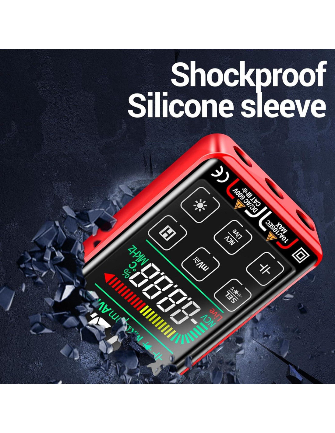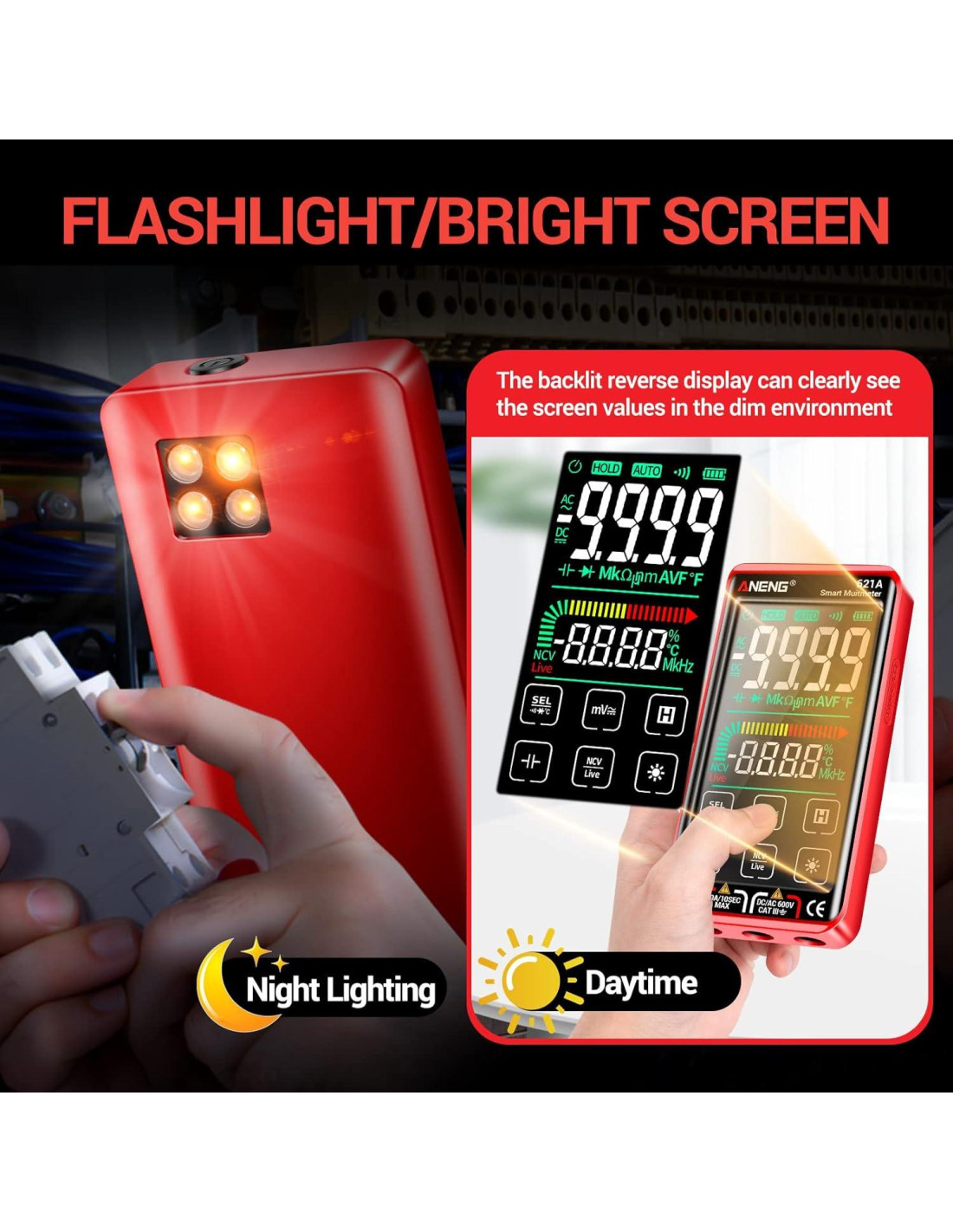 - Modo Inteligente Y Pantalla Táctil El multímetro predetermina el Modo Inteligente, el voltímetro puede probar automáticamente -- puede identificar el contenido de la medición y seleccionar el rango con la mejor resolución, ¡no necesitas hacer nada extra! El voltímetro True-RMS de 9999 Cuentas con una gran pantalla LCD a color, y linterna para fácil lectura incluso en lugares brillantes o oscuros. Además, el probador de voltaje puede mostrar barra analógica, temperatura en tiempo real, aviso de batería baja y aviso de fusible dañado.