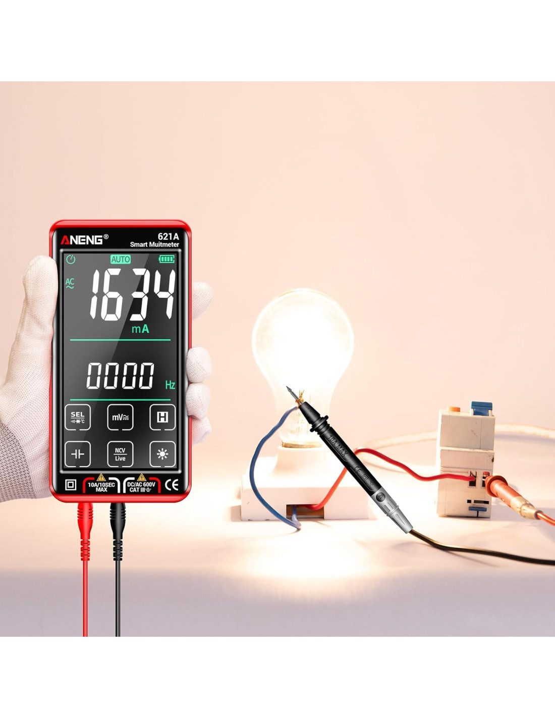 - USADO AMPLIAMENTE Y MIDE CON PRECISIÓN ANENG Multímetro Digital se puede usar para medir corriente AC/DC, voltaje AC/DC, resistencia, frecuencia, ciclo de trabajo, capacitancia, continuidad, diodo, temperatura, cable vivo/cero. No es solo un probador de voltaje; sino también un multi-probador como un probador de circuitos y medidor eléctrico, una adición imprescindible a todas tus herramientas eléctricas y electrónicas para uso industrial y doméstico.
