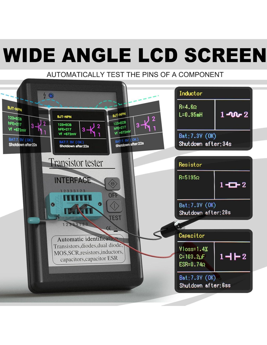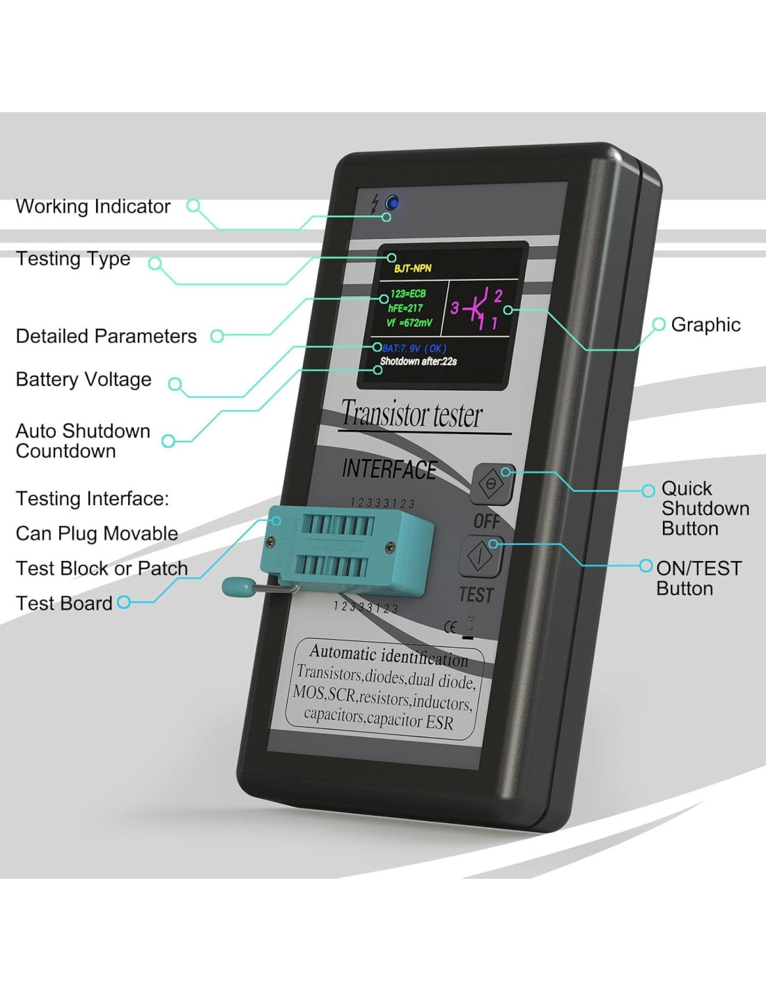 - FUNCIÓN DE APAGADO AUTOMÁTICO: Nuestro avanzado probador de transistores electrónicos posee función de apagado automático. Hay una cuenta regresiva de apagado mostrada en el monitor y el tiempo de cuenta regresiva de apagado se puede extender a 40s.