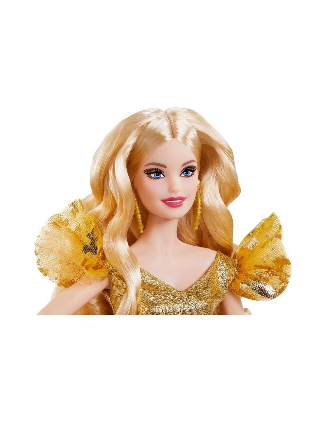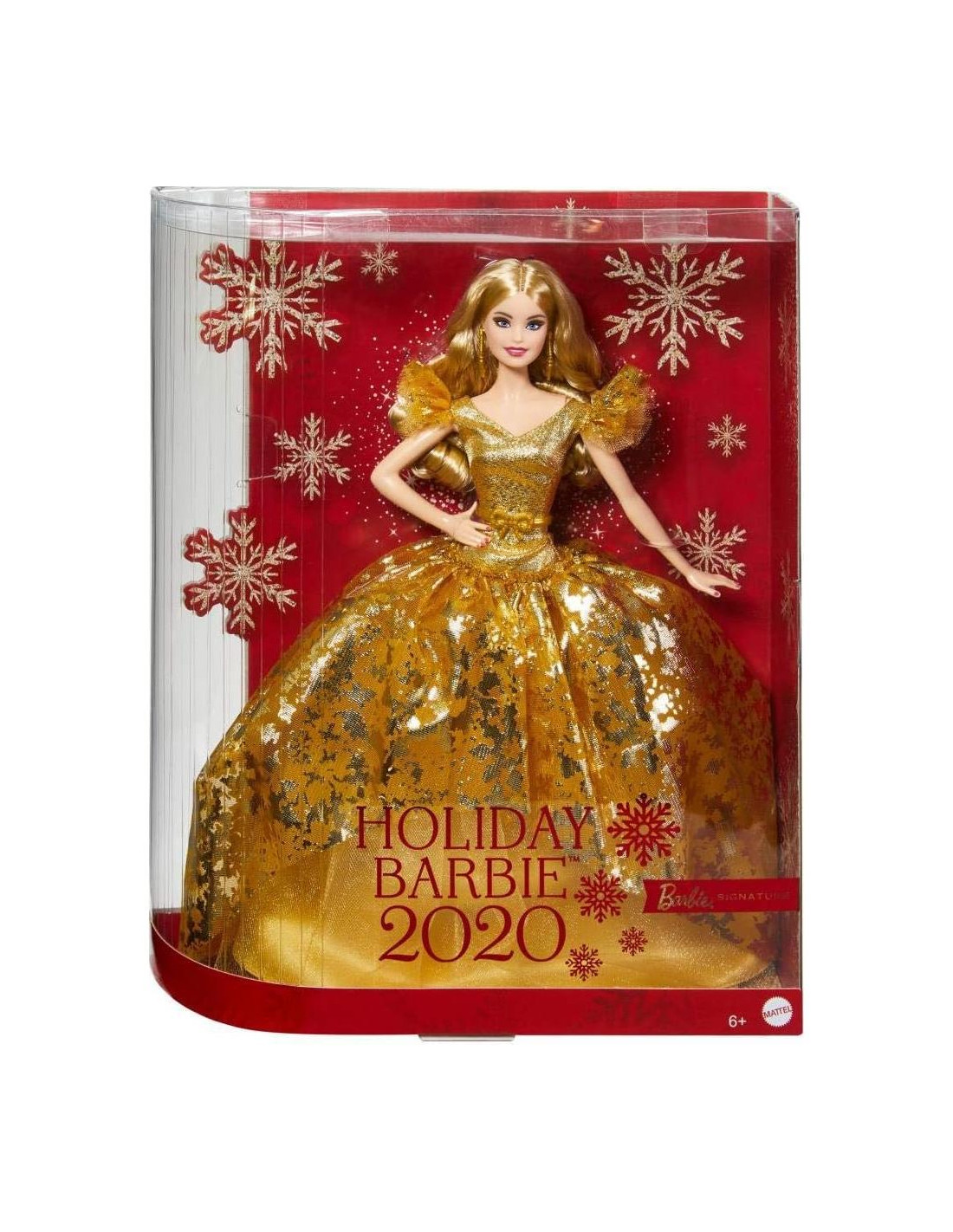 Es la temporada para ser festivo y alegre, un momento en el que los copos de nieve hacen que todo brille, y la calidez de la alegría navideña te llena de felicidad. Reflejando la radiante maravilla de la temporada, la muñeca Barbie de Vacaciones 2020 brilla de pies a cabeza en oro. Su vestido presenta un cuerpo dorado brillante con mangas acampanadas y una falda de tul con una superposición impresa de copos de nieve que brilla. Los detalles elegantes incluyen un cinturón con lazo y aretes de candelabro. Un maquillaje impresionante y brillante en oro y ondas rubias elegantes completan su deslumbrante conjunto. Que tu muñeca Barbie de Vacaciones 2020 sea un momento dorado más que eleve tu corazón e inspire a abrazar las maravillas que te rodean. En un empaque especialmente diseñado ideal para exhibiciones, esta muñeca Barbie de Vacaciones 2020 coleccionable es un gran regalo para niños de 6 años en adelante. Incluye soporte para muñeca y Certificado de Autenticidad. La muñeca no puede mantenerse sola.