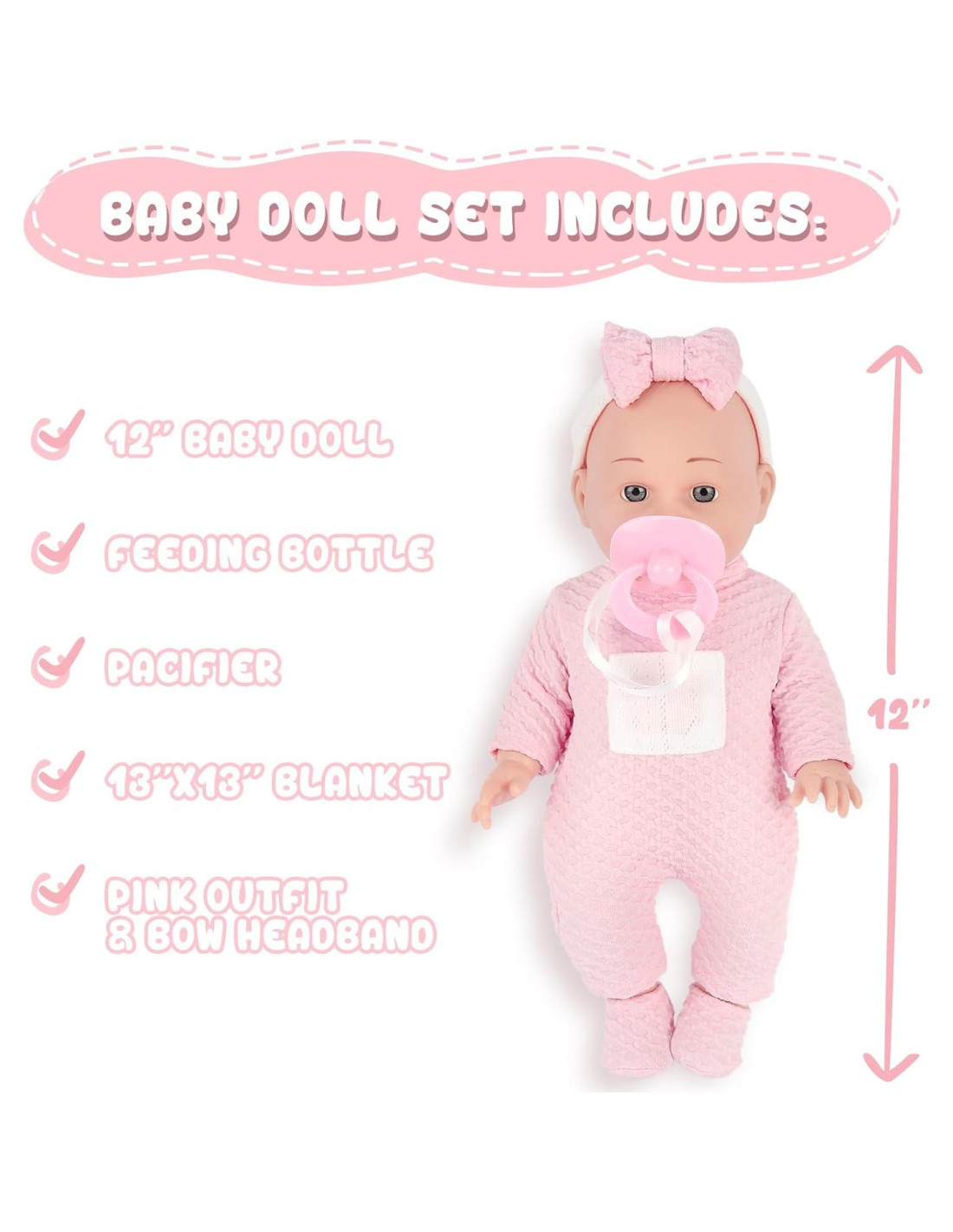 - Contenido de la caja de regalo --- Muñeca de 12 pulgadas (30,48 cm), chupete, biberón transparente (vacío), manta de 13''x13'' (33,02 cm x 33,02 cm). Tamaño pequeño perfecto para que los niños sostengan, abracen y lleven. El chupete está unido al atuendo, ojos brillantes y relucientes, mejillas suaves de bebé, deditos y dedos de los pies delicados, que hacen que la muñeca se vea realmente adorable y realista.