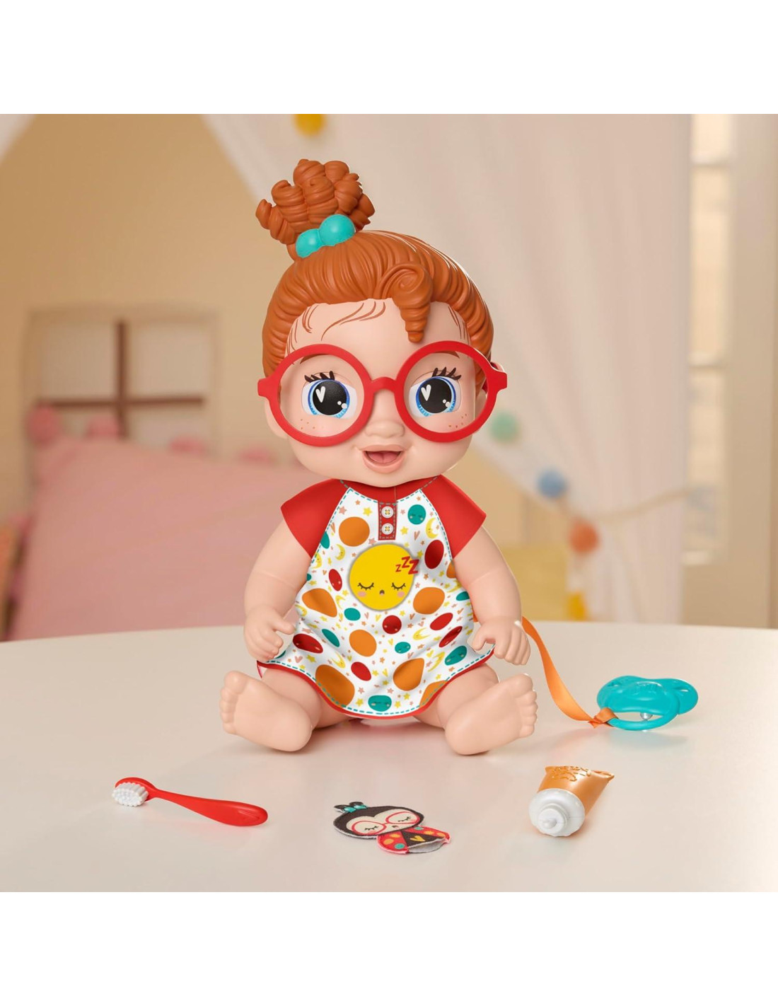 ¡Buenas noches, pequeña Dottie Doodle! Juega a la fiesta de sueño en cualquier momento con este adorable set de muñeca de 11 pulgadas (28 centímetros). Dale a Dottie Doodle su chupete para cerrar los ojos y quita el chupete para abrirlos de nuevo. El chupete está unido a su adorable pijama acogedor para evitar perderlo. Cuenta historias con su juguete de marioneta de dedo en forma de mariquita y luego finge cepillarle los dientes con el cepillo de juguete y la pasta de dientes de fantasía. Cuando busques regalos para niñas o niños o recompensas por buen comportamiento, seguro que les encantará este set de juego de muñeca. Baby Alive y todas las propiedades relacionadas son marcas registradas de Hasbro.