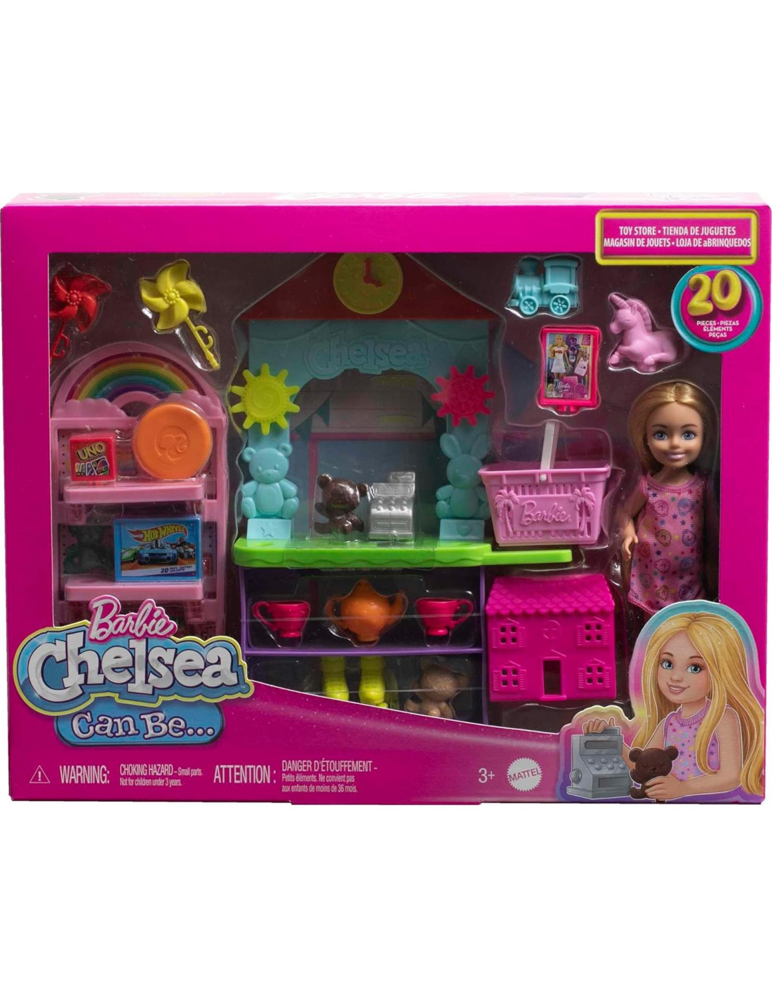 - Abre el juego de Barbie Chelsea Puede Ser... Tienda de Juguetes y despierta la imaginación con la muñeca Chelsea, muebles de la tienda y más de 15 piezas para contar historias, ¡incluyendo mini juguetes!