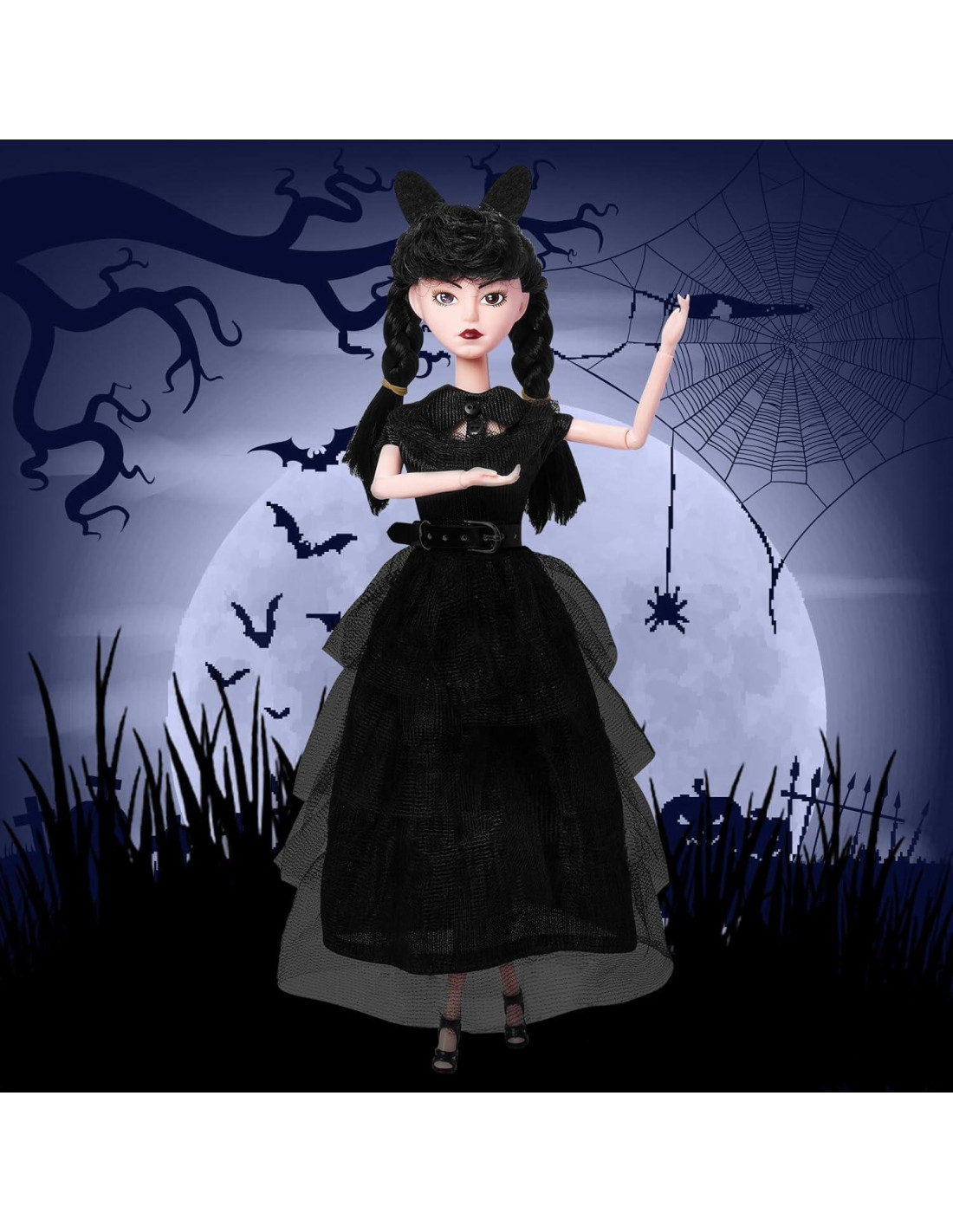 - Icónica y Clásica: Lleva a casa lo espeluznante y aterrador con esta muñeca negra de 11.5 pulgadas para niñas, vestida con su falda negra característica y tacones altos negros. Un imprescindible para cualquier fan de la Familia