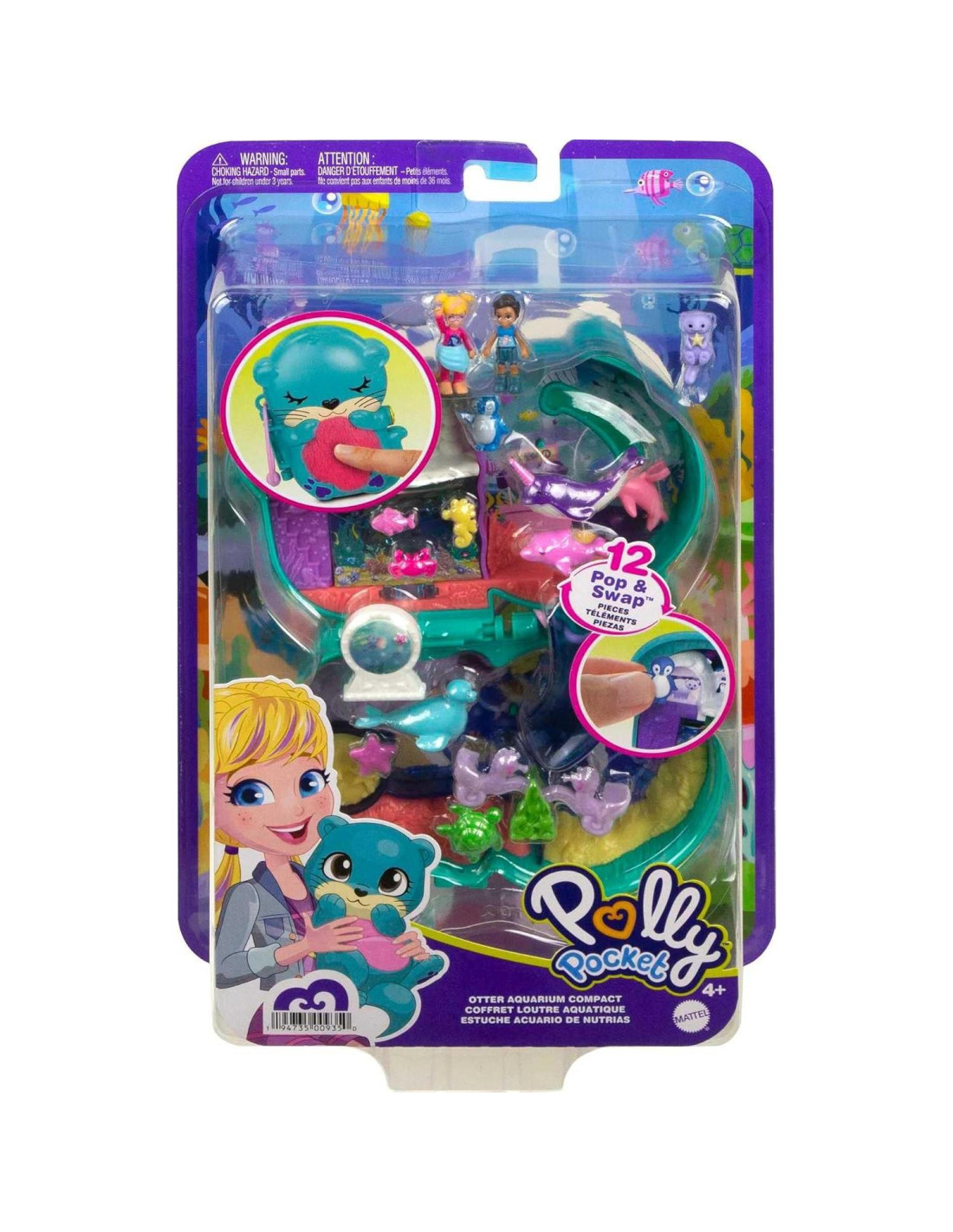 - El compacto Acuario de nutrias de Polly Pocket presenta un adorable diseño de nutria con un vientre suave y de felpa en el exterior y viene con muñecas micro Polly y Nicolás.