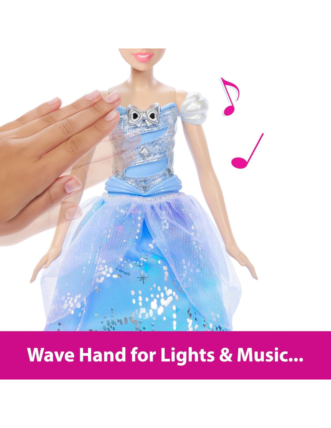 - Con el movimiento de la varita (o una mano), el vestido de la muñeca Cinderella se ilumina mientras suenan sonidos mágicos - cuatro patrones diferentes de luz y sonido en total