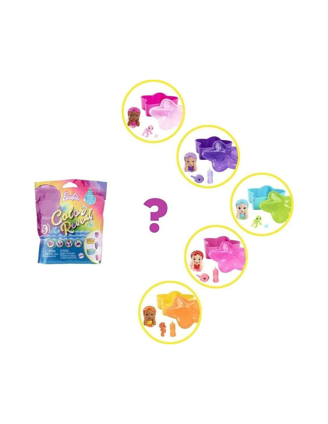 Barbie Revelación de Color Serie Sirena Muñeca Sorpresa Bebé - Barbie Revelación de Color mascotas ofrecen una experiencia de desempaquetado llena de sorpresas - ¡cinco de ellas! Los niños se sumergen en la serie merpet abriendo el contenedor de concha de colores brillantes para encontrar cuatro bolsas con su contenido oculto.