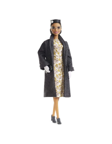 - La muñeca Barbie Rosa Parks lleva un vestido floral bajo un elegante abrigo de lana. Incluye gafas, guantes, un sombrero tipo pastillero y accesorios de bolso.
